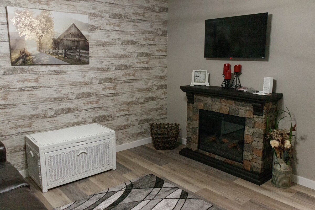 Once a small-town car shop, now a beautifully restored and cozy getaway. Sleeps up to 4 with a comfy bed & a couple convertible beds. Relax in the spacious living room with two plush L-shaped couches, a fireplace, and TV. Cook in the full kitchen, get work done at the desk, & laundry in unit. Every detail is brand new, warm, welcoming, and full of small-town charm. Right Across the Street is the Famous Dew Drop Inn & Kozy Kitchen. 5 Minutes away from Baetje Farms and The Artisan Wedding Venue.