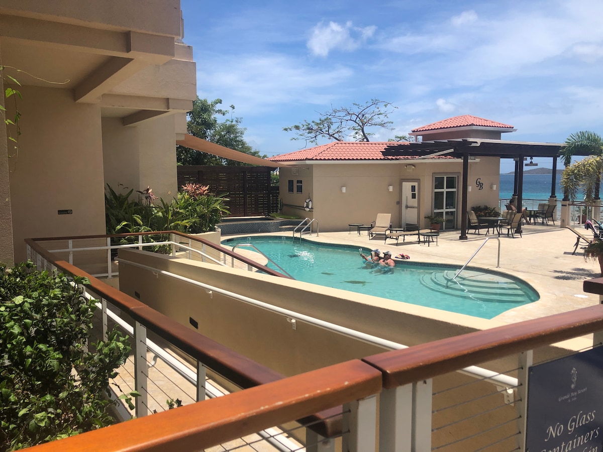 Our Seaside Studio suite is located on the first floor of the center front building at Grande Bay Resort - in the heart of Cruz Bay, St. John. We offer spacious and clean accommodations for your trip to paradise! Our Studio is a large open space with a king sized bed and a living room area with a queen sized sleeper sofa. It includes a bathroom and kitchenette along with a balcony overlooking Cruz Bay with seating for two. The resort offers a swimming pool, hot tub, beautiful pool deck as w