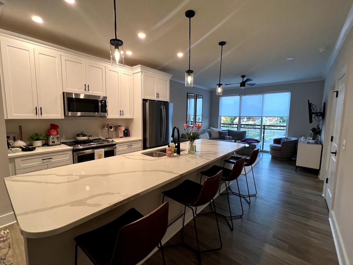 Welcome to your serene two-bedroom home on a quiet residential street. This fully furnished retreat features two queen beds, a kitchen, living room, and dining area, all adorned with elegant floral and gold accents. Relax in the living room with plush seating and a smart TV, or prepare meals in the fully equipped kitchen. With high-speed Wi-Fi, air conditioning, a washer and dryer, and a speed bike in basement, this home offers everything you need for a stylish and comfortable stay.