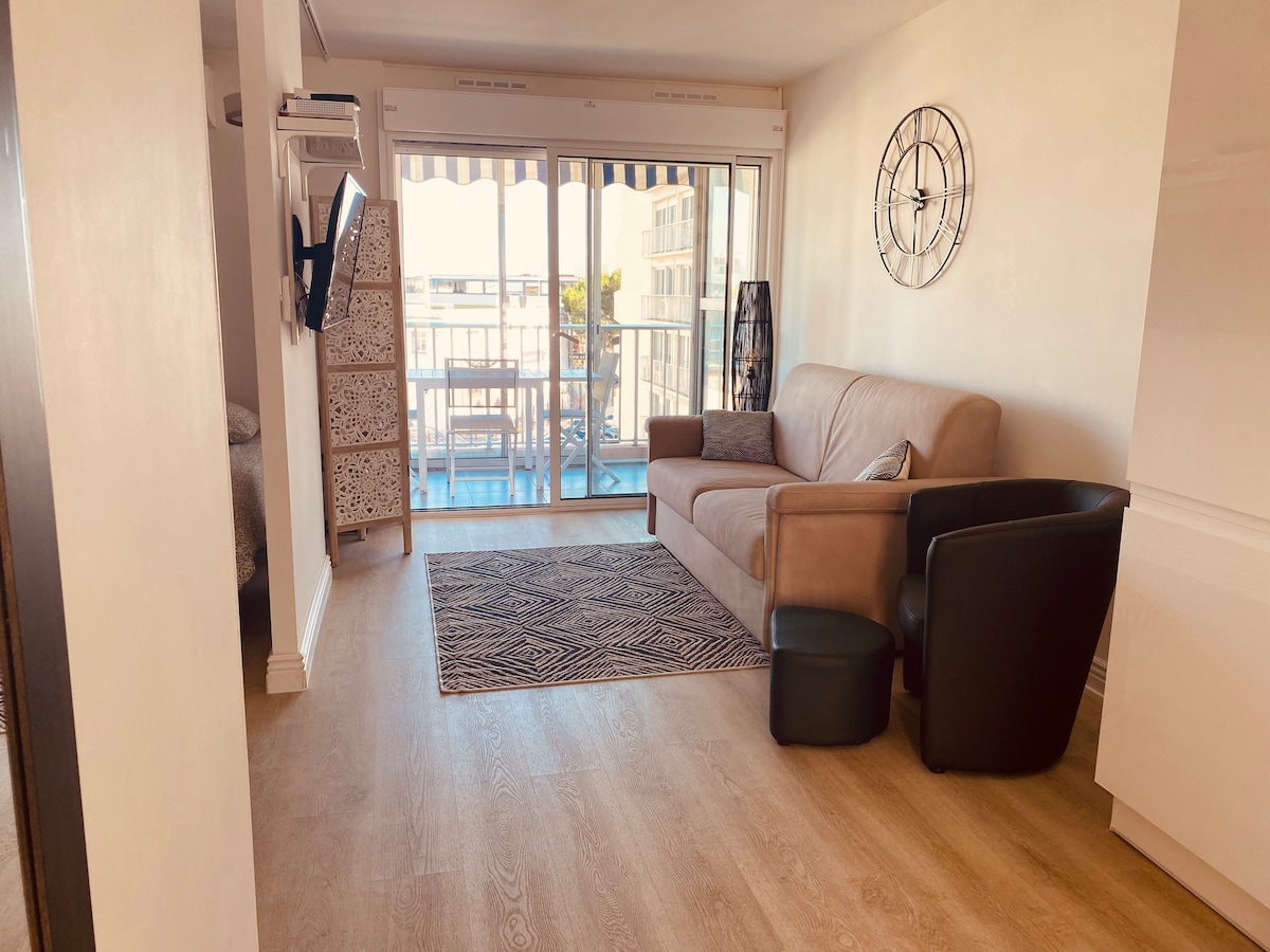 大型單間公寓,可欣賞海景,設備齊全的廚房、步入式淋浴間和空調。 非常安靜的地區。 公寓前面的停車場。 ️ ️自主入口。房東可視體驗達人的可訂狀況在場。 可步行前往: 200米:面包店、屠夫、超市(包括有機食品)、酒吧/煙草、藥店、披薩店等。500米: -銀 行-聖洛朗杜瓦港(酒吧、餐廳、夜店 ) -乘坐巴士10英尺即可抵達海灘: -「CAP 3000」購物中心