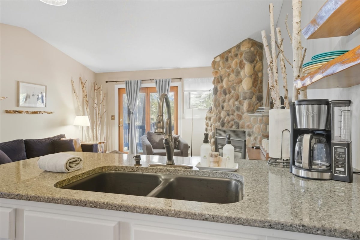 Birches公寓於2025年翻新,配備設備齊全的廚房,配備電磁爐、不鏽鋼電器、配有大床的客廳、燃氣壁爐和湖景、配有大床的獨立臥室,以及配有瓷磚浴缸/淋浴間和洗衣中心的全功能浴室。冬季,巨人岳高山纜車和越野滑雪道步行即可抵達,而夏季房客可以享受附近的湖泊、海灘、季節性戶外泳池/熱水浴缸、步行小徑和高爾夫球場/自行車道。