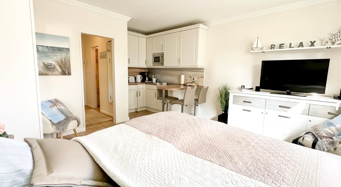 我們出租一間舒適的小型 1 房公寓,面積 25 平方公尺。 客廳還有折疊床( 180 × 200 )。 廚房配備了冰箱、洗碗機、咖啡機、烤麵包機和微波爐。 淋浴間。寬敞的陽臺邀請您享受日光浴。 地點非常好,距離堤壩200公尺,距離碼頭和Gosch 400公尺。 適合瑜伽愛好者!距離Kubatzki Hotel 100公尺,距離新的Hotel Urban Nature約100公尺。