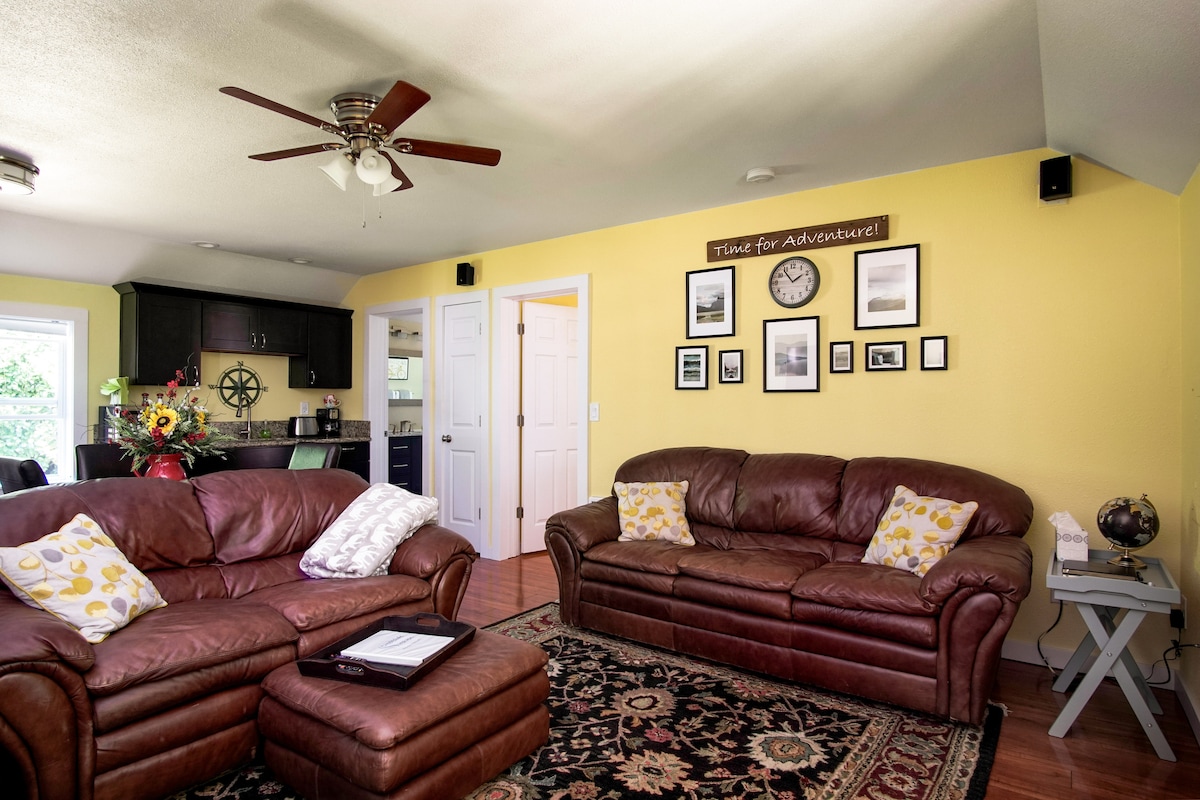 在我們寬敞明亮的閣樓公寓住宿一晚。享受獨特而溫馨的室內裝潢,或在我們1.5英畝的房源周圍散步。 也許甚至在我們的露臺上在火邊享用一杯葡萄酒。如果您有興趣外出,我們距離波特蘭僅20分鐘車程,位於許多其他景點的中心。 一天結束時,您可以欣賞美麗的日落景色,並在舒適的加大雙人牀上安頓下來。