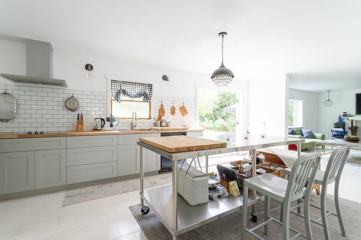 這間設計師小木屋結合了天然材質和現代裝潢,精緻又舒適。 從房源步行即可抵達令人驚嘆的泉水池塘(或在其中游泳!)。 在甲板上休息或在日光浴室享用咖啡。 室內設有三間臥室、兩間全套衛浴、配有時尚舒適家具和燃木壁爐的客廳,以及設備齊全的廚房,烹飪樂趣無窮。 在10人桌旁招待家人和朋友,然後繼續到戶外,手拿飲料。