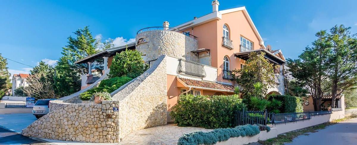 寧靜安靜的別墅,大院子裡有很多綠色,海灘有私人特色。 這座別墅只有三套公寓,保證您在沒有擁擠的人群的情況下享受愉快的住宿體驗。公寓寬敞,配有俯瞰大海的大露臺,並配有所有家具、電器和空調。從院子走幾步即可抵達海灘。它有一個適合小孩的沙灘部分,陰涼,但有一個混凝土碼頭,可以乘船前往。