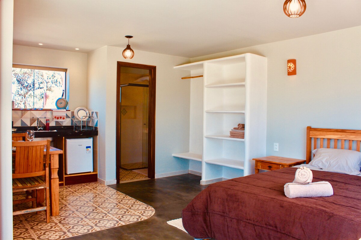 Um flat que vai encantar você. Aqui você tem tudo que precisa para passar dias de conforto em meio a natureza do Cerrado. Cama confortável, chuveiro quentinho, mini copa com tudo que precisa para criar suas refeições. * Mono ambiente * Cozinha equipada * Roupa de cama e Banho * Wifi 300 megas * Ar condicionado * Banheira privativa