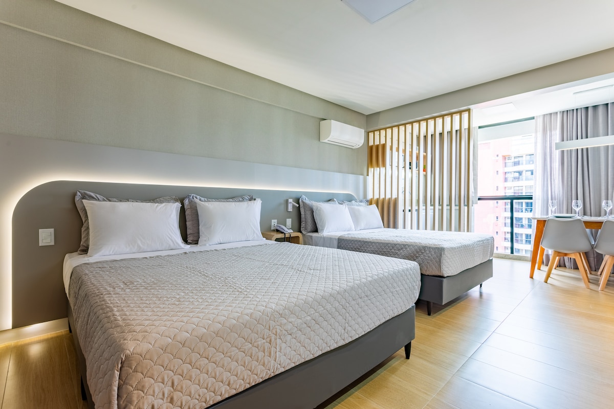 舒適的公寓,家具齊全,裝飾精美,地理位置極佳。享受優雅的高標準體驗。在戈亞尼亞,全景城市景觀,高樓層和私人車庫,適合那些想要私隱和舒適的人,最具成本效益的住宿,快速協助,直接與業主打交道。 我們有商品,您可以透過 pix 或 QRCode 付款購買。 最佳的緊湊住宿體驗。 來到我們的城市,入住 Flat.Gyn。