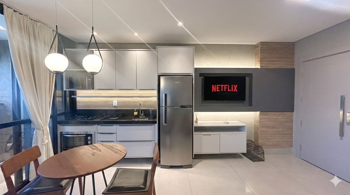 非常舒適方便,在18樓,在坎波格蘭德最好的地區。 靠近Afonso Pena大道和Campo Grande購物中心。 單間公寓配有空調、標準雙人牀、55英寸電視/Netflix、小廚房、沙發牀。 我們有額外的牀墊。 我們有早餐籃和浪漫裝飾套餐可供選擇。 在Vertigo Premium Studios ,您可以使用美容院、桑拿、加熱泳池和無限邊緣。