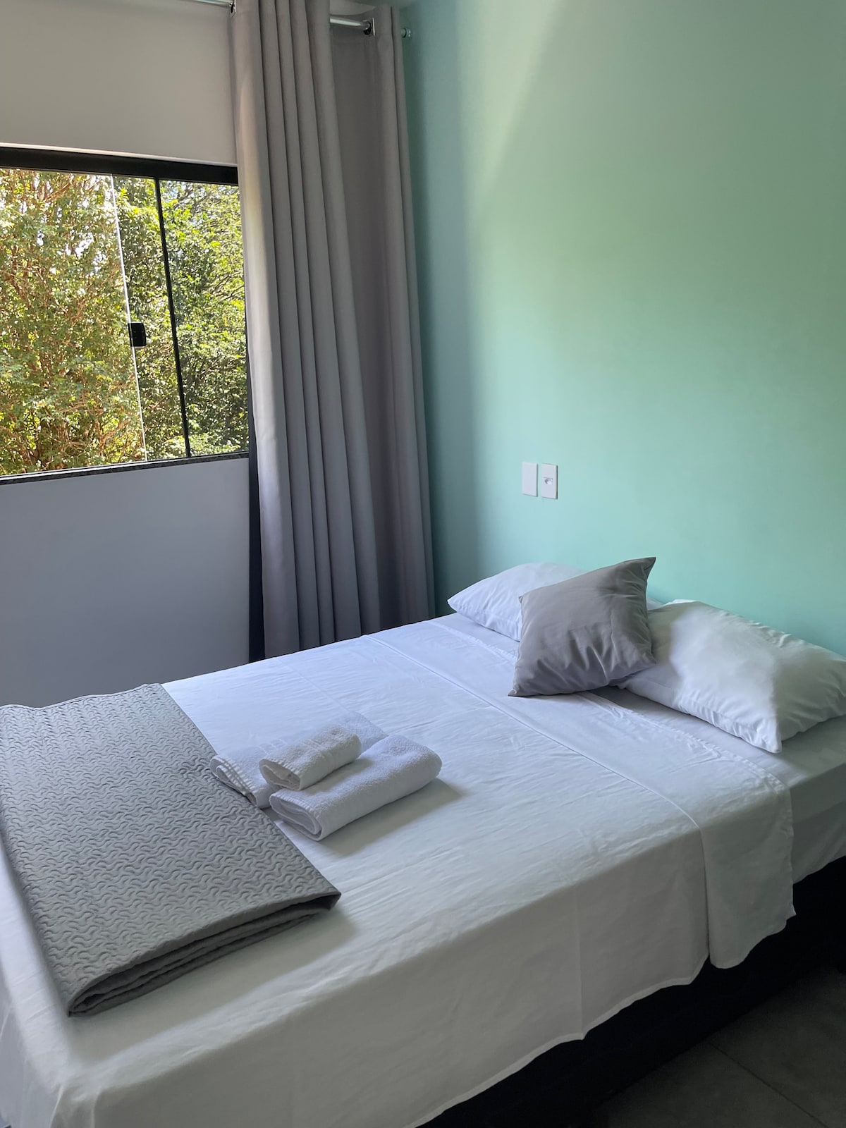 單間公寓,配有空調,整個空間,地理位置優越,靠近UEM和新中心、市政市場、超市、麵包店和餐廳。配有 1 張雙人床、1 張單人床、沙發床、衣櫃、電磁爐、微波爐、迷你冰箱、32 吋電視、桌子和 2 把椅子、鍋具和餐具。我們提供床單、浴巾和超細纖維毛毯。車庫可停放中小型車輛。安靜的家庭建築,配有洗衣房和Wi-Fi。