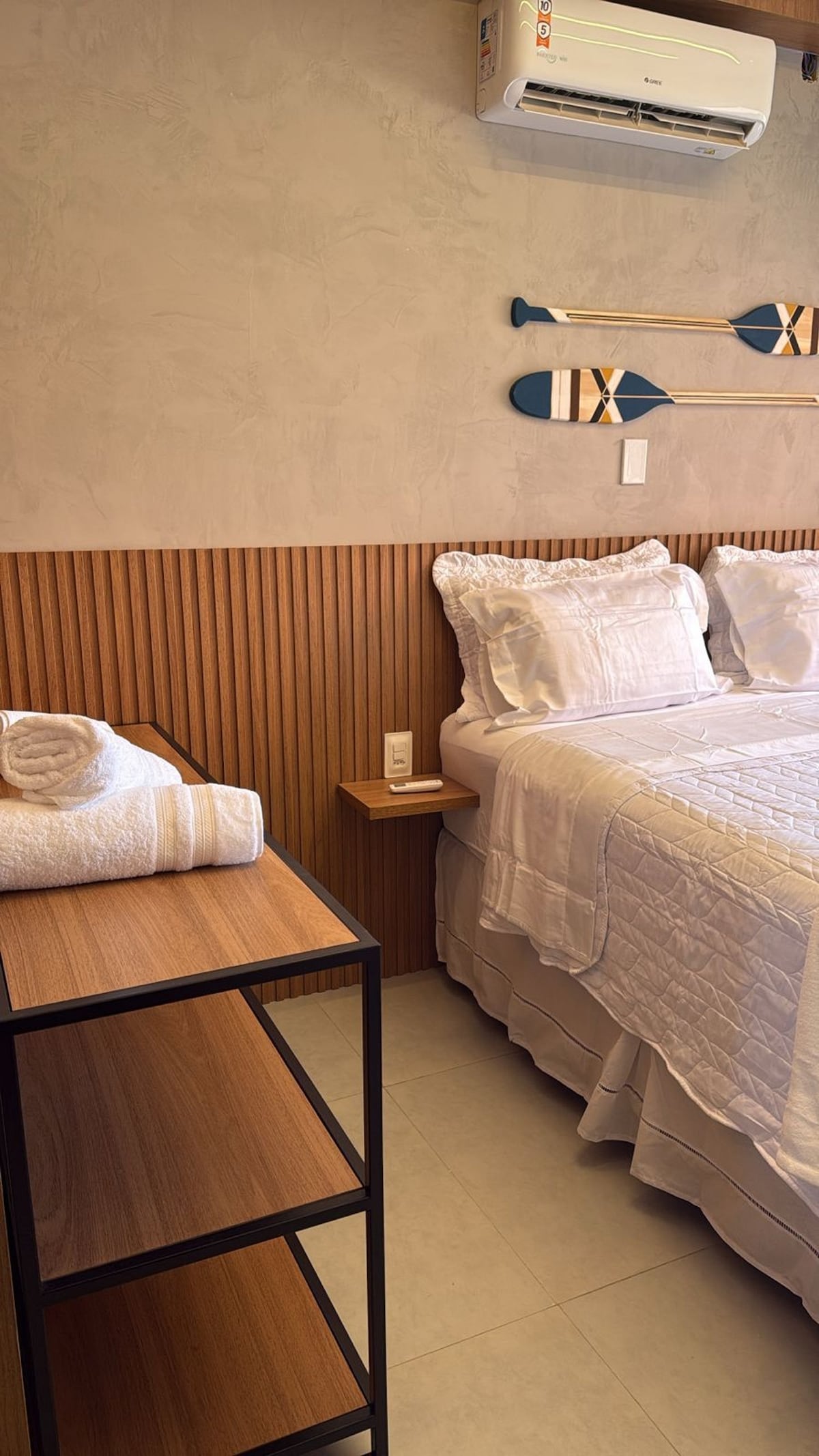 Viva uma experiência de hotel boutique neste flat com design exclusivo e alma praiana. O espaço une sofisticação e conforto, apresentando marcenaria fina, painel ripado e decoração curada com elementos náuticos. Desfrute de uma suíte climatizada, banheiro premium com pia esculpida e uma cozinha funcional equipada. Perfeito para casais que buscam um refúgio moderno, elegante e relaxante. Cada detalhe foi pensado para oferecer uma estadia inesquecível.