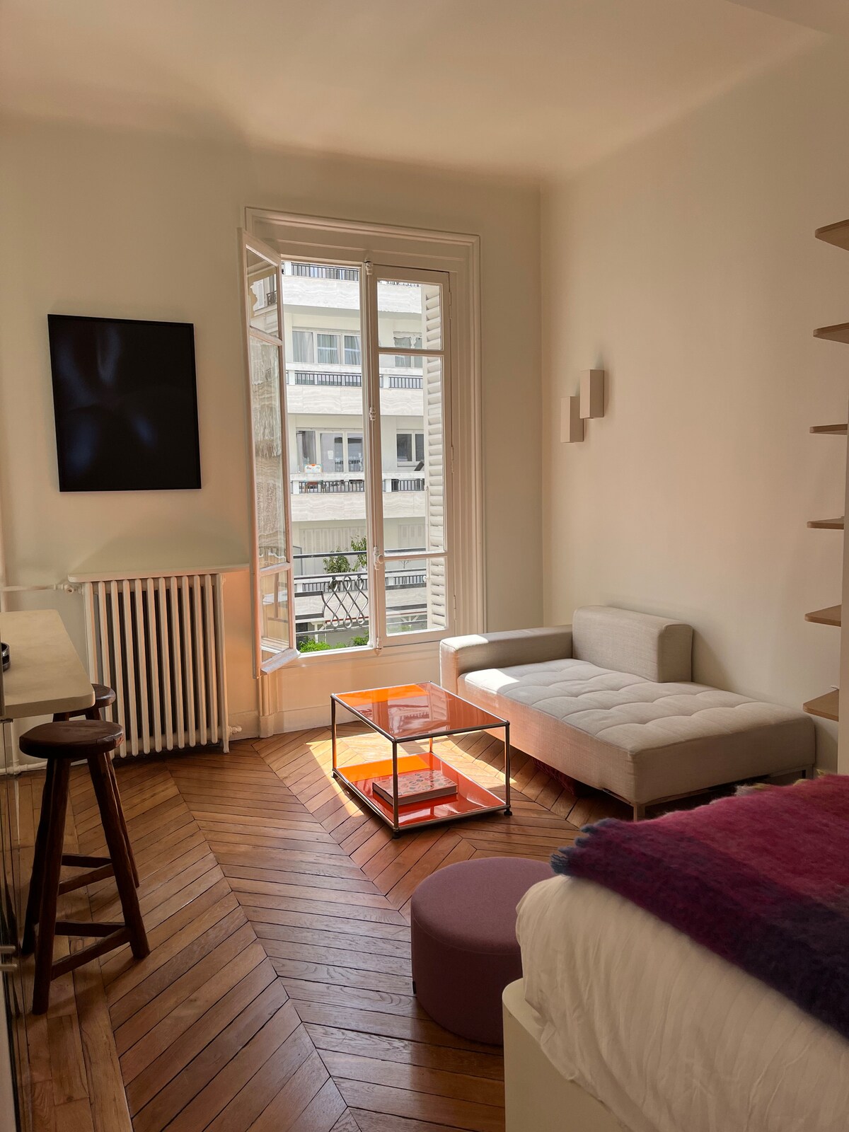 這間房源最近剛翻新,提供舒適的 1 間臥室空間,配備一張雙人床、寬敞的衣櫃,以及可俯瞰塞納河的窗戶,探出頭就能看到艾菲爾鐵塔。客廳配有舒適的沙發、配有Netflix的電視和設備齊全的小廚房。優雅的浴室配有義大利淋浴間。位於充滿活力的中心街區,靠近地鐵站,交通便利。區域和建築非常安全。