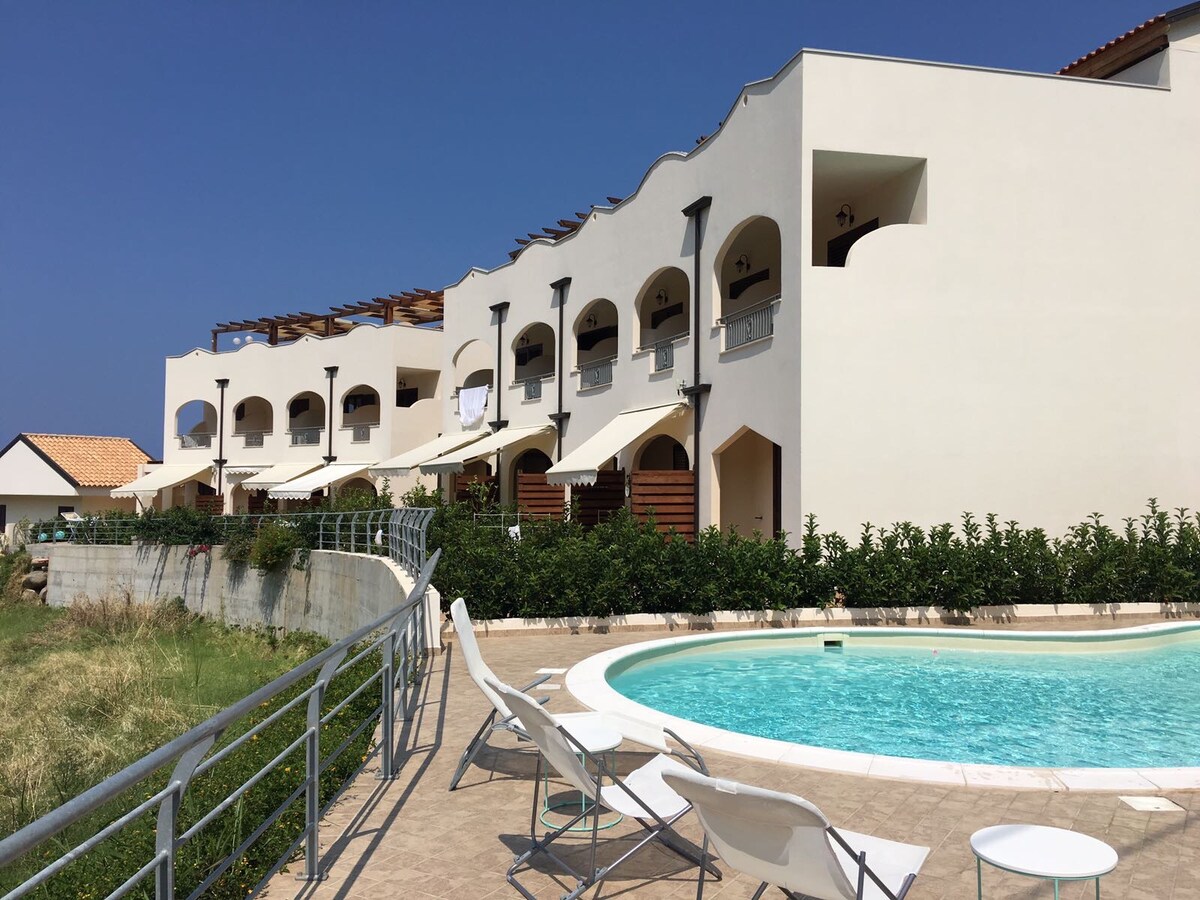 Boutique flat on the 'coast of the gods' in Parghelia/Tropea in Calabria. Refurbished and renewed in 2020. Max. 4 pers. No animals Living room and fitted kitchen with washing machine/dryer, dishwasher, fridge, oven, induction hob. 2 bedrooms with double beds and spacious closets. Bathroom with shower. 2 spacious terraces, communal swimming pool (July an August open and free to use). Beach within walking distance, in front of the door! Airco, WIFI , safe, parking in front of the door.