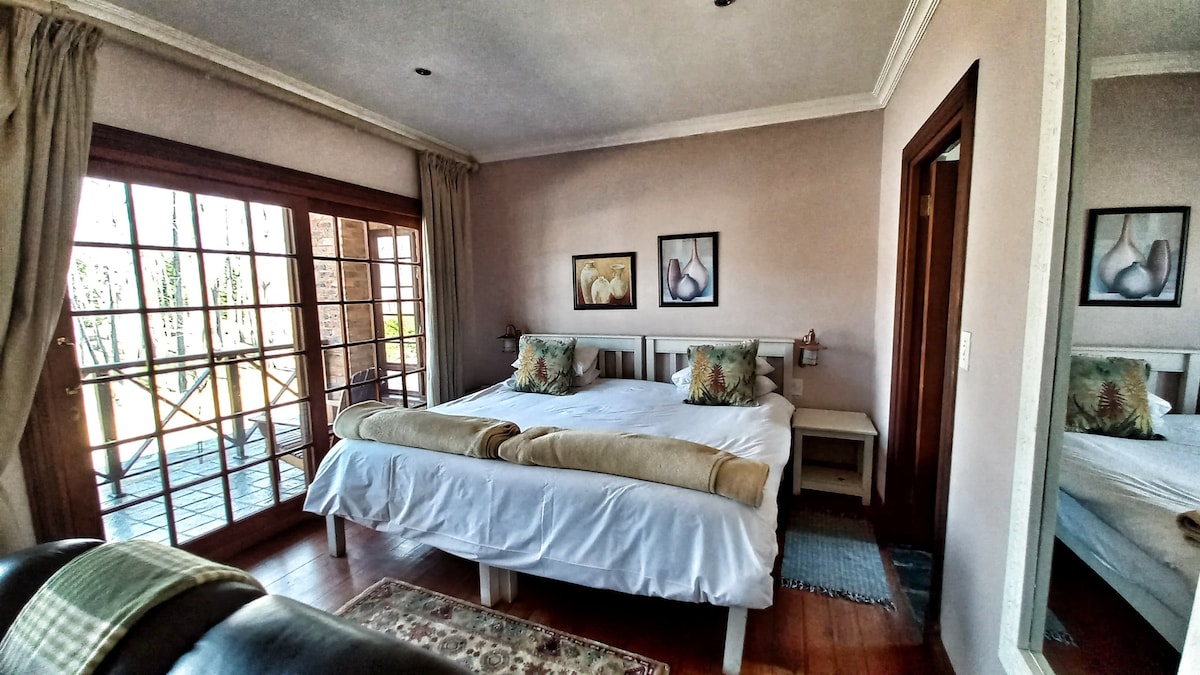 The smallest of the 7 chalets with one bedroom and en-suite facilities. Set amongst towering Kiepersols, thick varied indigenous vegetation and a gently sloping lawn terrace right onto the reed surround of the Kiepersol 4 hactare dam. Fully furbished kitchen. Bathroom with tub and shower. All towels and linen provided. Complimentary firewood. Apologies...no wifi or TV..just nature. Cottage serviced daily. Indoor fireplace. Outdoor Weber braai. Please close cottage to prevent entry of monkeys....