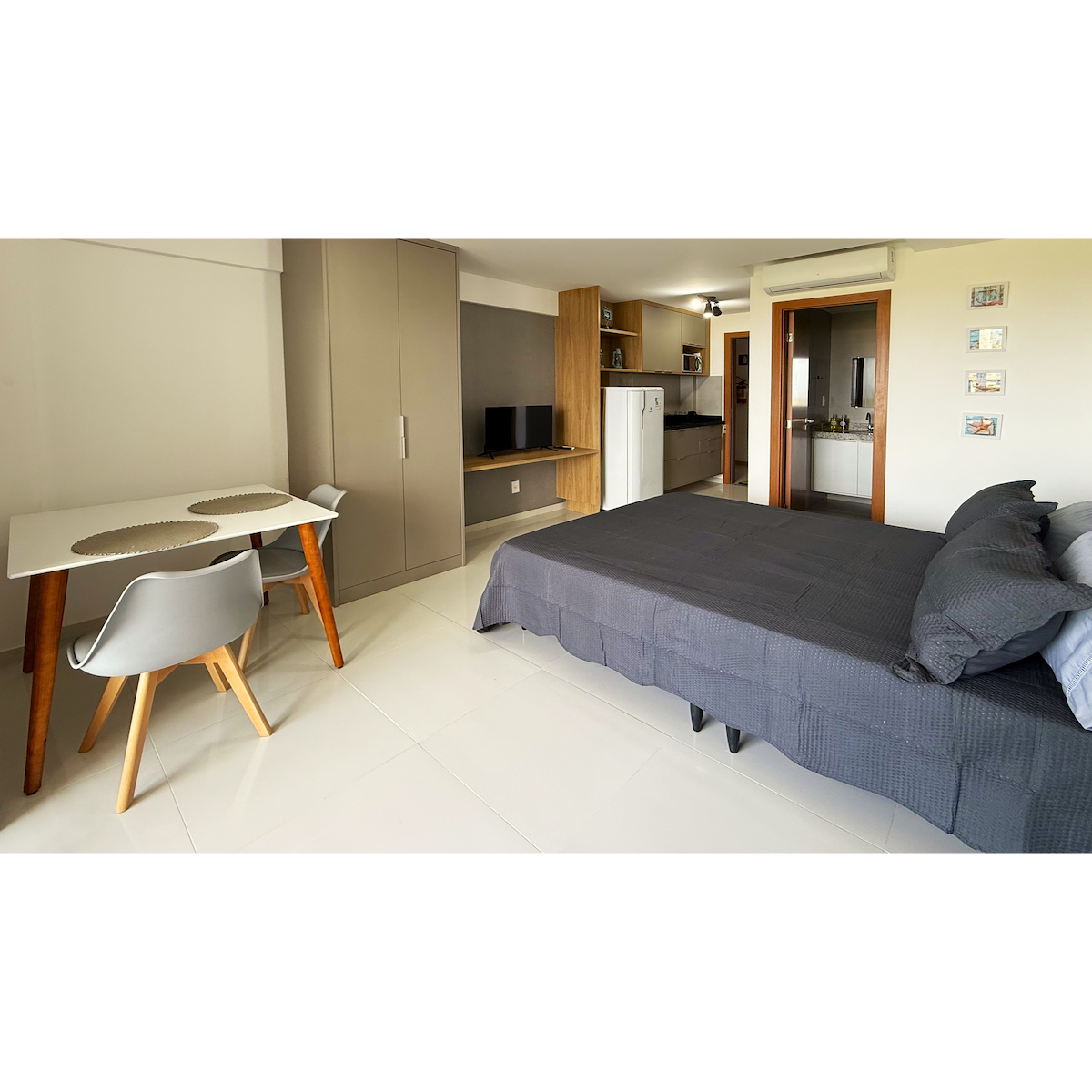 Ambiente calmo a 150m do mercado, a 200m da praia e 8 min do aeroporto. Apto inteiro, acomoda até 3 pessoas- 2 camas, 1 ar condicionado, chuveiro elétrico, smart tv, fogão, geladeira, purificador de água, cafeteira, saunduicheira e ferro elétrico. Roupas de cama e banho. Conforto e praticidade em localização próxima a farmácias, mercado e restaurantes. Rooftop com uma belíssima piscina e estonteante vista para o mar, além de academia completa, brinquedoteca, bicicletário e espaços homework.