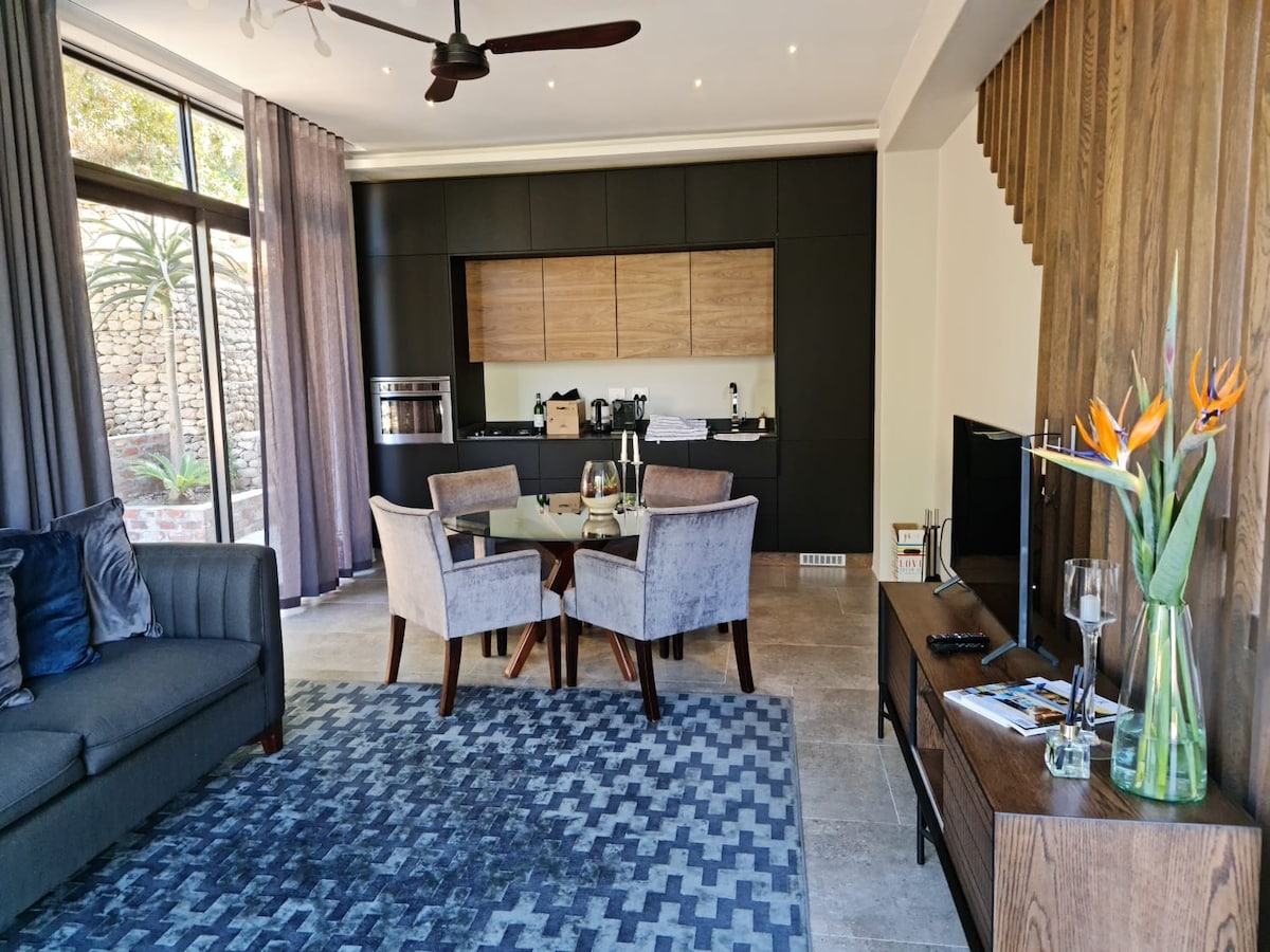 Hochwertig eingerichtetes Luxusapartment für 2 Personen in Somerset West, Bestlage. 10m lange Panoramaglasfront mit Blick auf Berge und Meer. Das Apartment hat Wohnbereich mit Küche, Badezimmer und ein Schlafzimmer. Es steht eine Nespressomaschine zur Verfügung,Toaster, Wasserkocher, Fön, Handtücher und Bettwäsche. Extra langes King size Bett und Fernseher. Pool und Außenanlage sind zur gemeinschaftlichen Nutzung vorhanden und Sauna und Jacuzzi können wir nach Absprache auch anbieten.