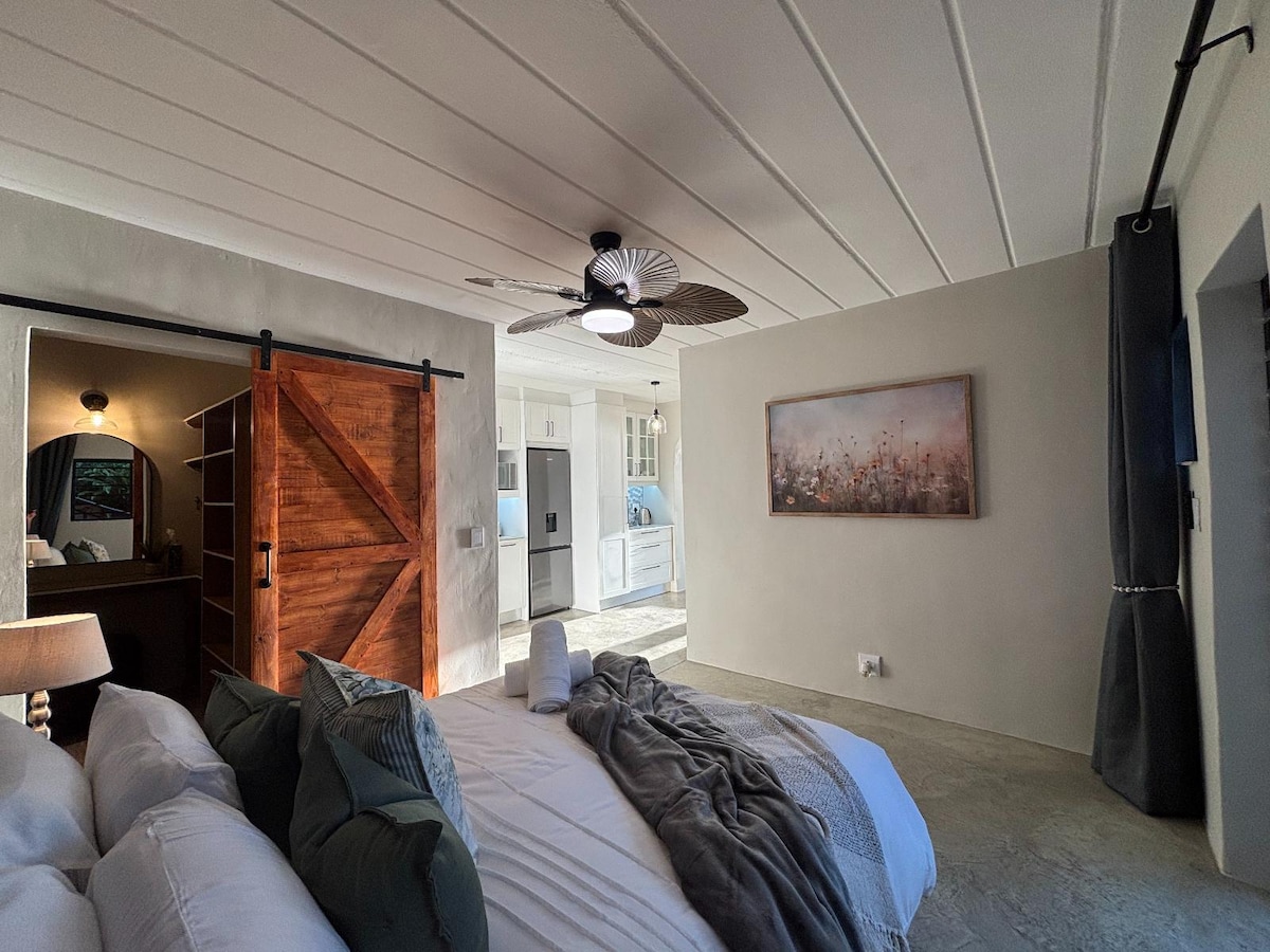 這間充滿光線的公寓完全獨立,有自己的入口,與主屋分開,非常適合安靜祥和的住宿體驗。 室內有一間舒適的臥室,配有套房浴室,以及一個寬敞的起居區,配有用餐空間和小廚房,方便您使用。 公寓由太陽能備用電力和太陽能間歇泉供電,因此您可以享受舒適的住宿,而無需擔心電力短缺。 我們與兩隻狗和一隻貓分享我們的家,這些寵物都很友善,喜歡人