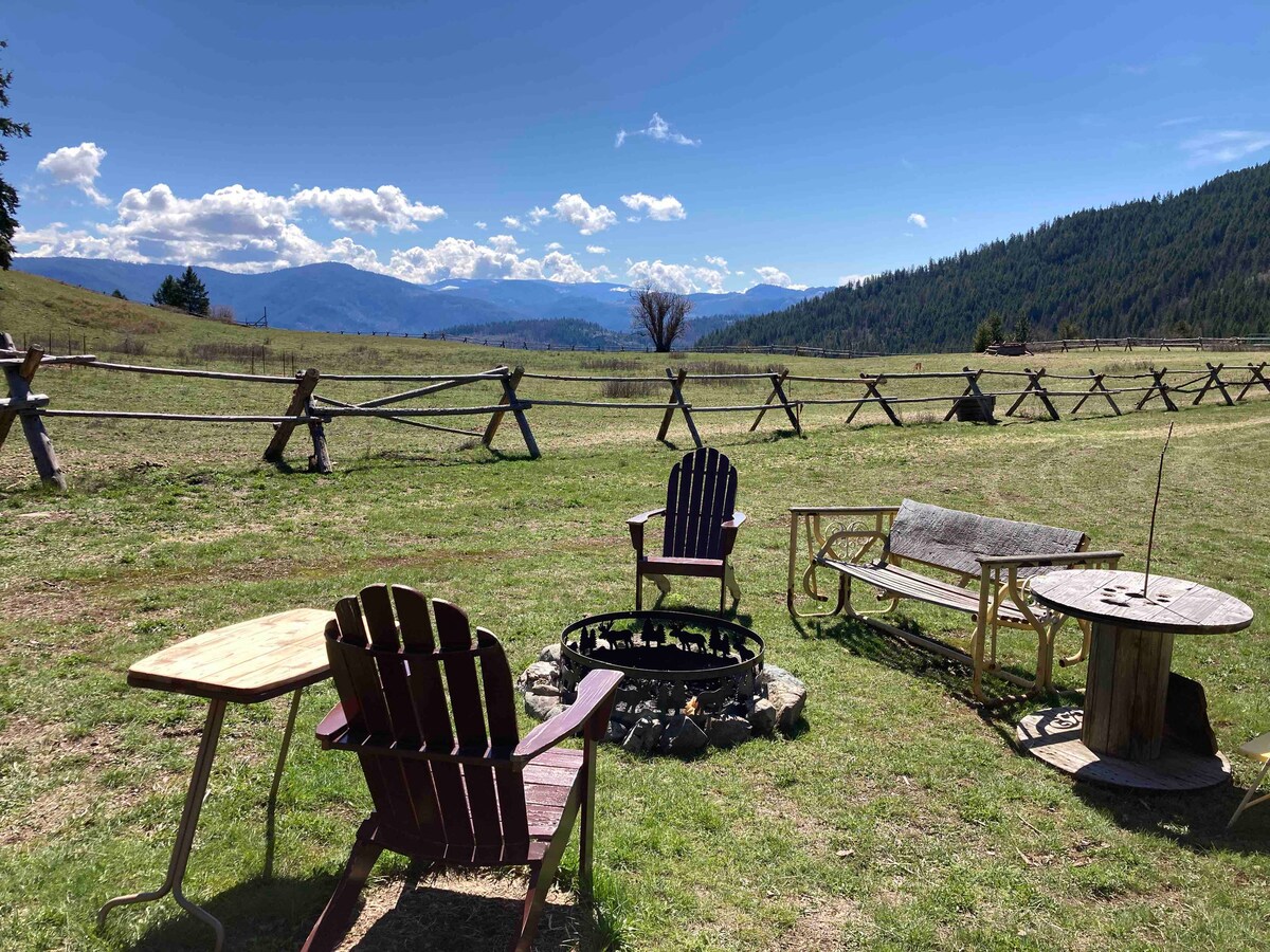 這間舒適、部分隔開的客用小屋坐落在200英畝的牧場和陡峭的山坡上。朝北、東和南的落地窗可欣賞壯麗的山景和美麗的夜空+有頂露臺。房客專用的私人戶外廁所。欣賞美景、徒步旅行、騎自行車、騎馬、在小溪旁放鬆、在哥倫比亞河或水壺河游泳,並在肘湖釣魚。 有很多事情可做,而且都超級靠近或實際上就在房源內!小屋沒有通電網路