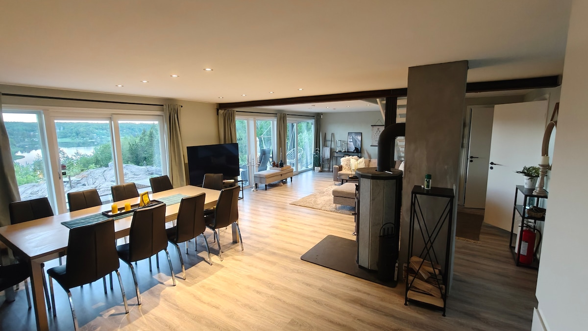 Unique and modern nordic design. idyllic and undisturbed surroundings in harmony with nature. Panoramic view over the fiord. 20 min. from Sandefjord/1,5 hour from Oslo/1,5 hour from Kongsberg alpin. The beach in front is Bronnstadbukta, area with rich nature, perfect for adults and kids. Great hiking right outside, with numerous popular summit hikes and hiking trails. Beautiful fjord with islets and reefs if you travel by boat. Cabin also suitable for two families with 2 baths ans 4 bedrooms.