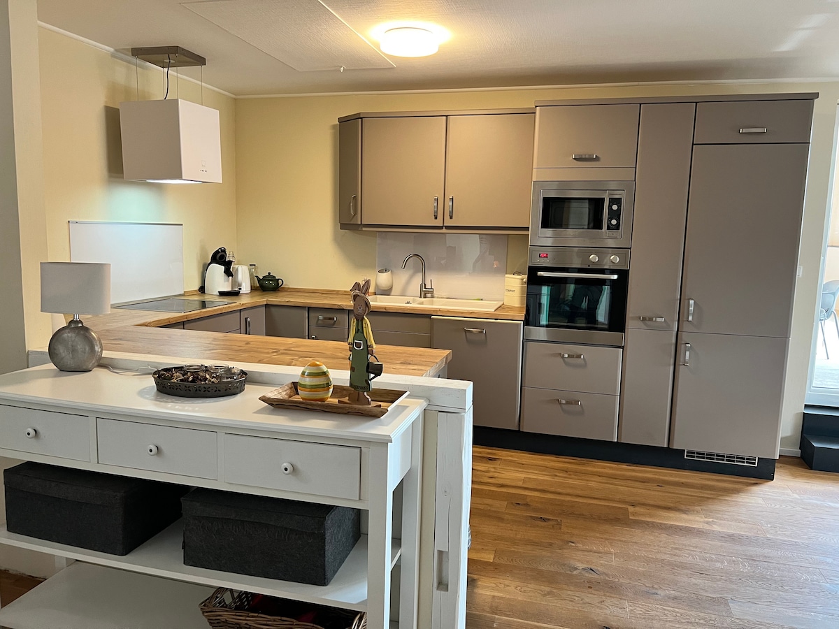 !注意:6月至9月期間最短租賃期為週六至週六1週! 獨立小屋,位於馬池中間的鋼架上,就在列出的Hexenburg城堡前面。 三面露臺,配有烤肉設備,四周有牧場,附近有Hexenburg騎馬設施。 房子提供所有必要的設備,如洗碗機、帶冷凍室的冰箱,當然還有帶淋浴間和馬桶的獨立浴室。