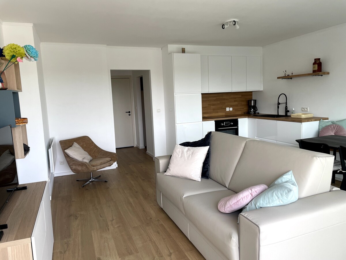 位於美麗住宅頂層的獨特頂層公寓 - 位置優越(商店、海灘、停車場、電車) - 55 平方公尺的住宅,配備全新且完整的設備 - 3 個露台(50 平方公尺),可俯瞰大海、城市和游泳池 - 距離商店和免費停車場不到 500 公尺 - 溫水泳池(6 月至 9 月) - 高速網路,配備 WiFi 中繼器 - 客廳和臥室有電視,可收看 Netflix - 咖啡豆咖啡機(提供咖啡)