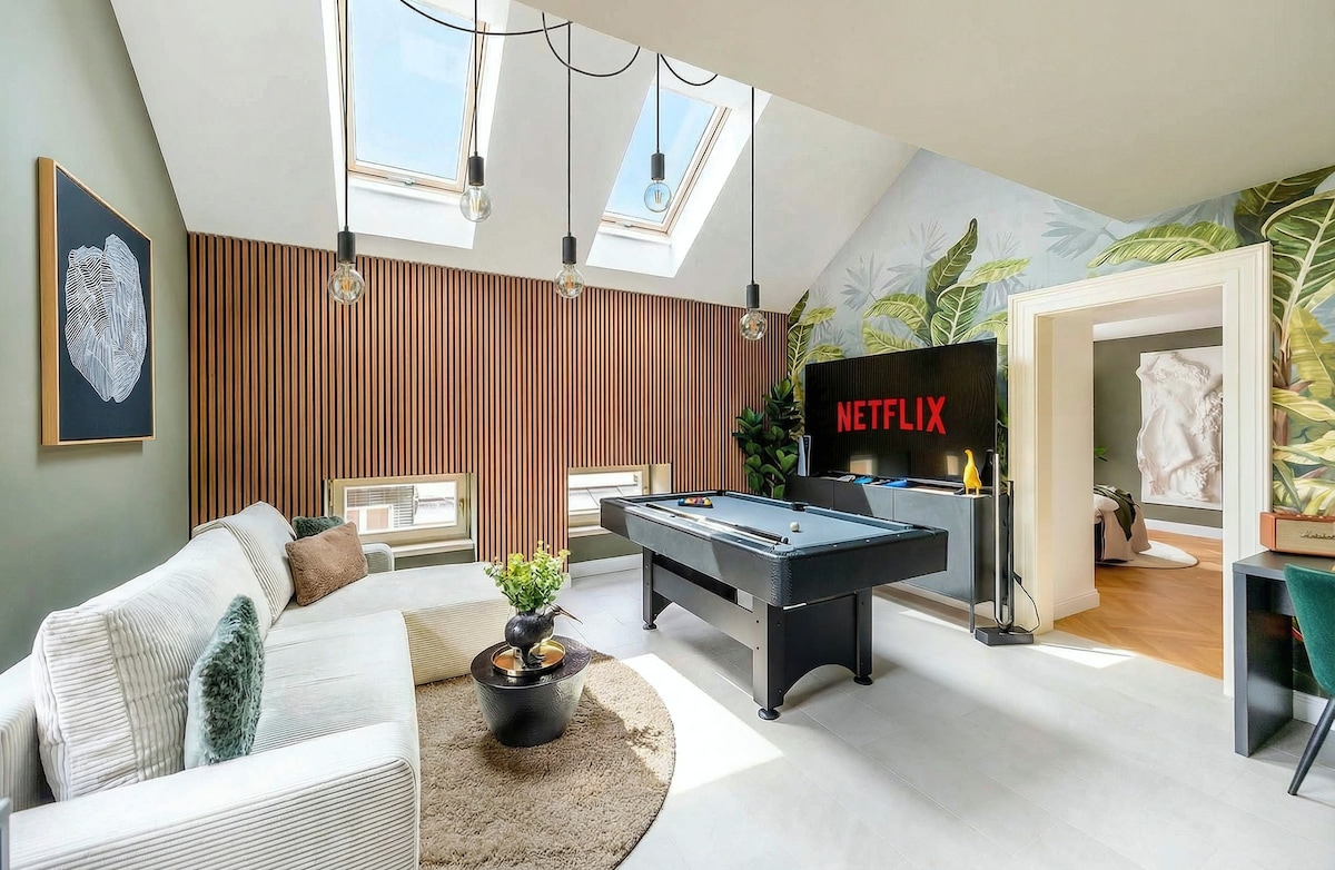 This gorgeous home next to the Petřín Hill and Kinsky Garden parks and a short walk from the Charles Bridge features a contemporary interior combined with the beautifully preserved original wooden floors. Bold feature walls and potted plants add a vibrant style with pastel-colored furniture making each space feel inviting. There are 2 bedrooms with 2 bathrooms ( both ensuite ) and a spacious living room. Wifi is highspeed with speeds 100 -150 mbps . There is a nice cafe directly in the house