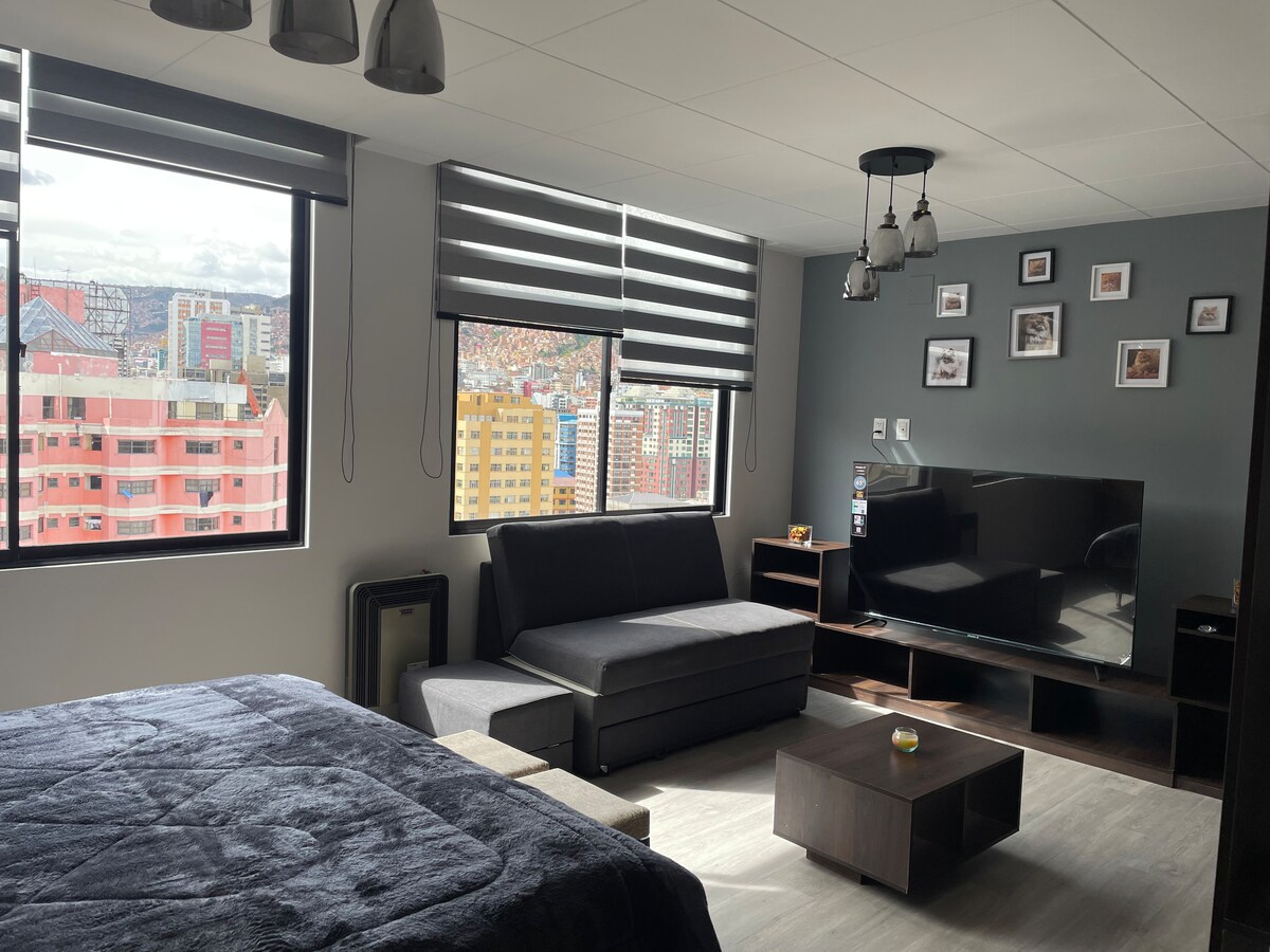 Enjoy a unique experience in our panoramic apartment 🏙️ in the heart of La Paz. Surrounded by restaurants, cafes, attractions, plazas, pubs, supermarkets, and much more. Located on the 18th floor, you won't miss any of La Paz's beauty. The apartment is equipped with everything you need to make you feel at home 🏠 . From the doorstep, you'll find transportation to all points of the city 🚌. The building has 24-hour security and surveillance for your safety.