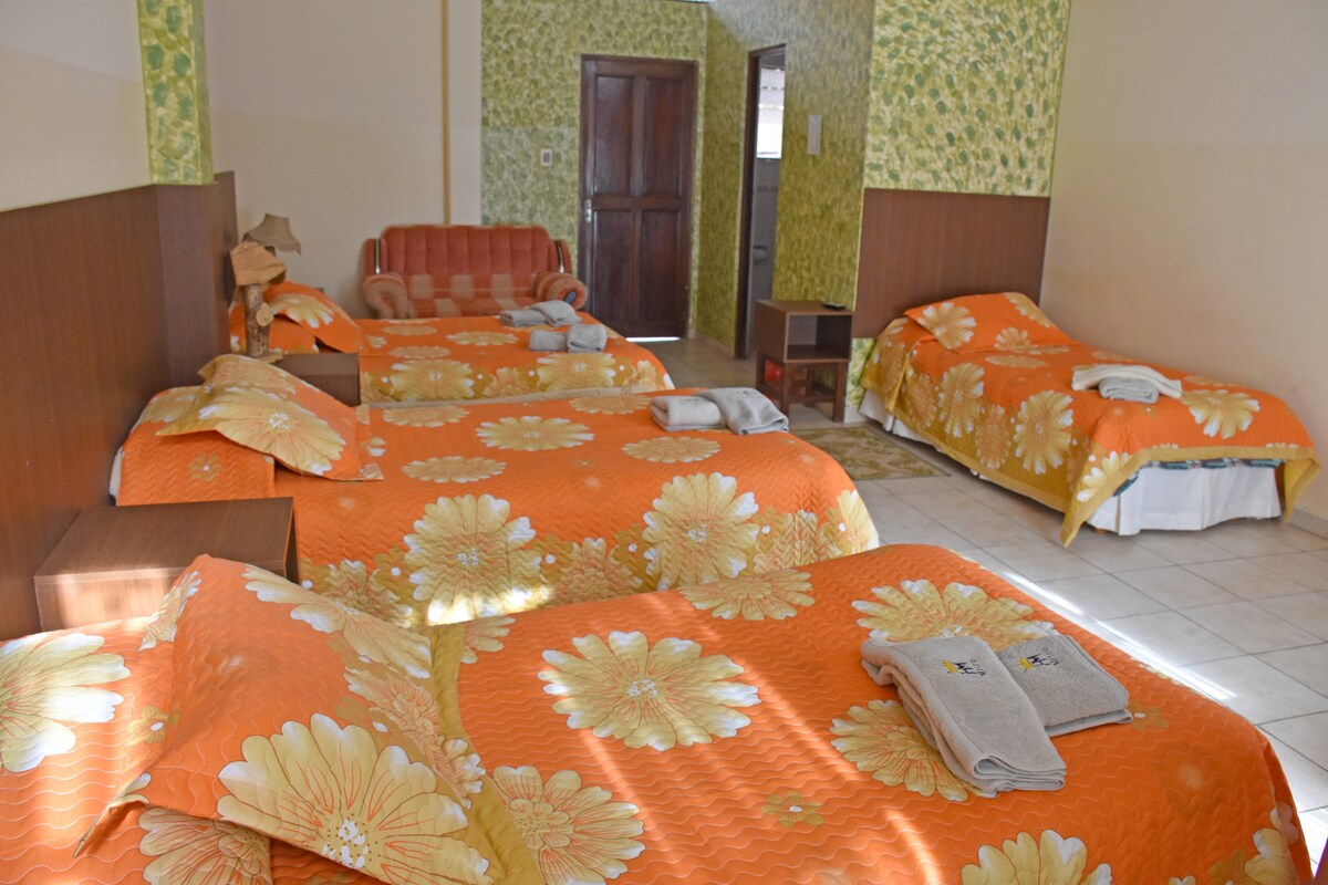 Habitación familiar con bañó pribado, tiene una cama matrimonial y dos simples, acceso a cocina y terraza contamos con garaje para grandes coches y pequeños se paga por separado