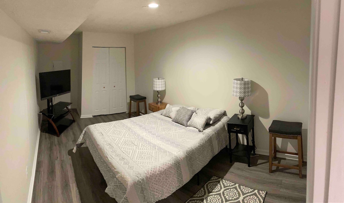 Experience unparalleled comfort in your own private sanctuary: a fully equipped bedroom and bathroom, a dedicated workspace with a full desk, cozy living area with TV and cinematic projection, and a separate exercise room with elliptical & weights. Enjoy a private entrance & serene surroundings nestled by the woods on a secluded road. No shared spaces, just the tranquility of a home away from home. Complete with amenities like a refrigerator, microwave, and coffee/tea setup for added convenience