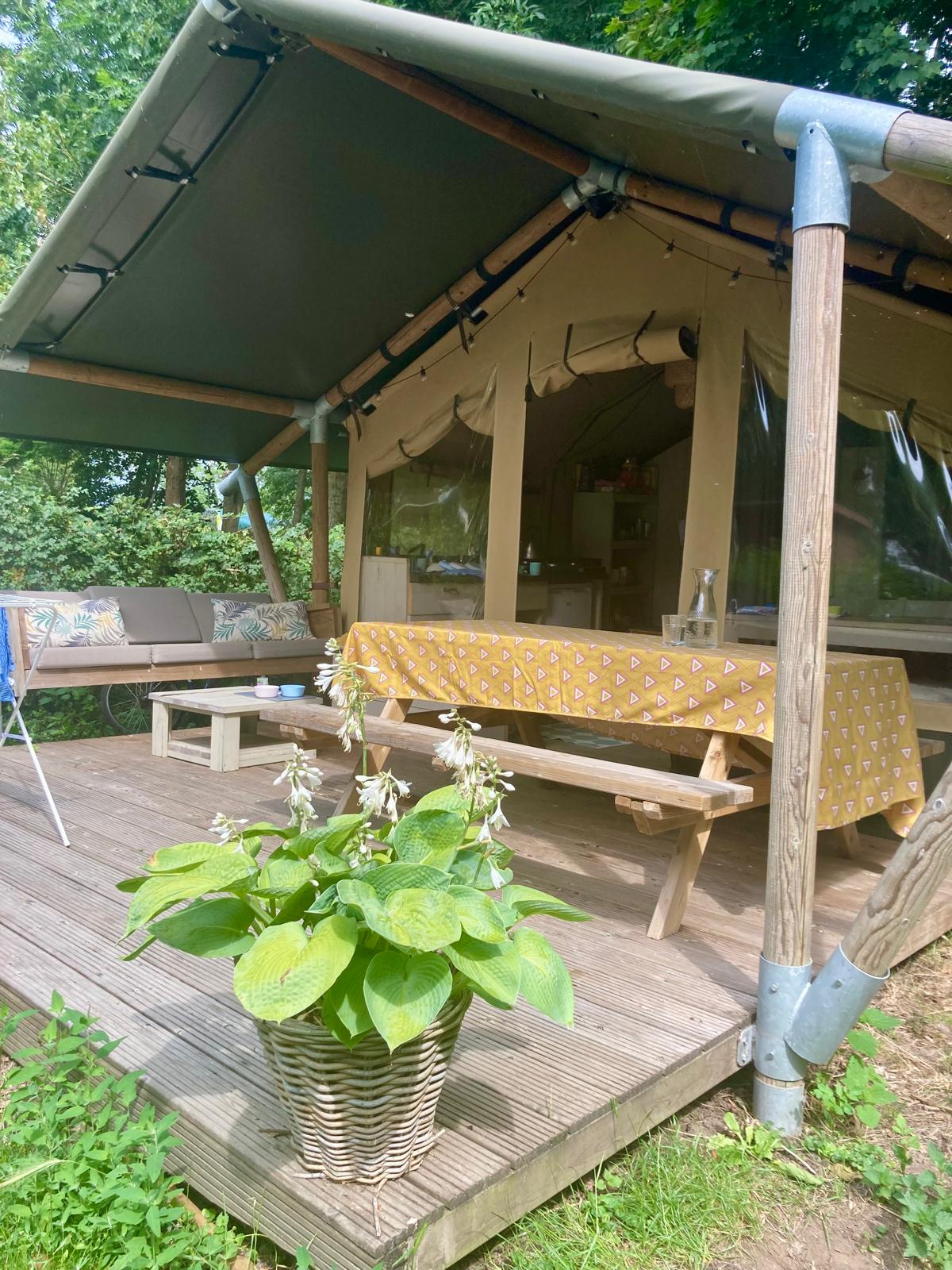 Geniet van een heerlijke vakantie in onze ruime luxe 6-persoons glamping tent. Op het grote vlonder terras met lounge set kunt u lekker ontspannen en genieten van het mooie uitzicht.