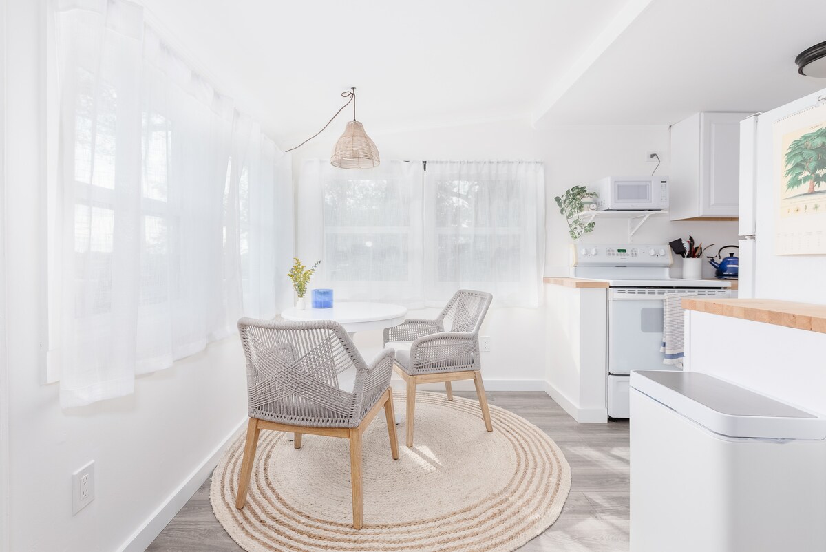 逃離城市,在大自然中工作!完全私人的小屋,可欣賞花園景觀、中央空氣和暖氣地板。距離原始海灘和市中心、LIRR、漢普頓Jitney、3家大型雜貨店、星巴克、有機市場、商店和餐廳1英裏。 加大雙人牀、有線電視、冰箱(有冰)、微波爐、戶外烤架、私人庭院,非常適合情侶、獨自旅行者、1-2個小孩。 我們歡迎小狗入住,價格為100美元。請發送訊息給我們,告知我們大小和類型。主屋內有工作的情侶/業主。
