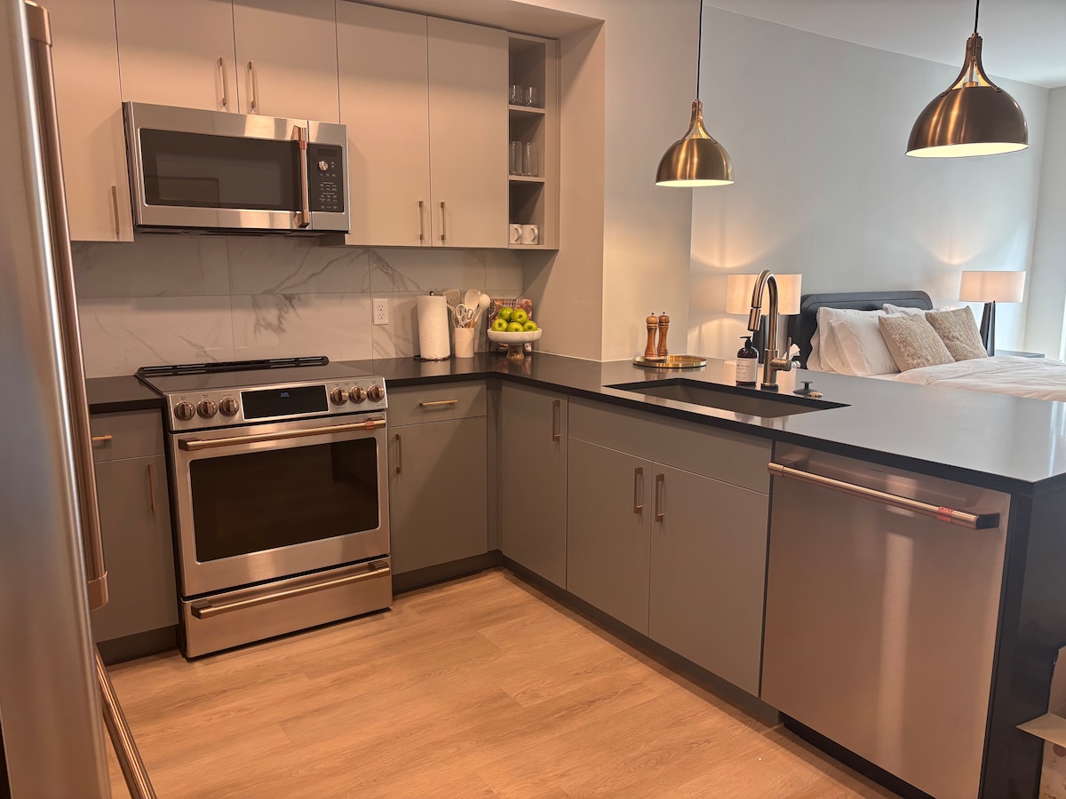 這間全新的現代化單間公寓配有: ⤷ 大型健身房 按⤷ 摩浴池(全年開放) ⤷ 泳池(冬季泳池關閉, 5月再次開放) 配備撞球桌和洗衣板的⤷豪華俱樂部會所 ⤷ 燒烤架、瓦斯火坑和泡菜球場 ⤷ 指定的工作空間 ⤷ 高速WiFi 設備齊⤷全的廚房 ⤷ 免費停車位 ⤷ 安裝55吋Roku電視,可存取您最喜愛的所有串流應用程式 ⤷ Keurig 咖啡機,提供免費咖啡、奶精和甜味劑