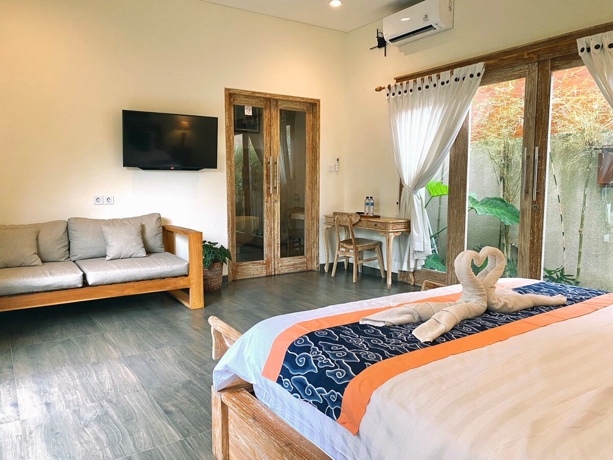 舒適的河景竹屋,是5間獨立小屋的一部分,坐落在樹林中。以永續的方式建造和裝備,對環境的影響最小 在私人陽臺或休息室的舒適吊床上觀鳥,俯瞰12公尺無邊際泳池 一旦被大自然重新激活,您可以向北前往巴厘島烏布鎮中心繁華的文化中心和美食夢想,或向東開車20分鐘到最近的薩巴黑沙灘