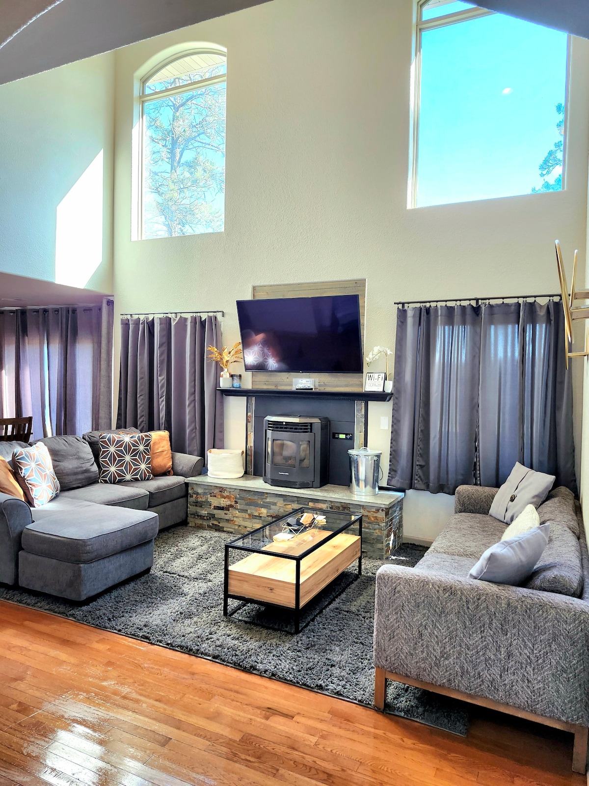 日出山脊,寬敞的戶外區域。獨立入口、停車位和露臺區域! 公寓位於主屋下方;地面層,沒有樓梯。現代鄉村風格,重新設計的時尚浴室/廚房,配有全套烘焙/烹飪設備。 WiFi和Roku,可免費使用Netflix、Disney +、Max大螢幕電視。 一間臥室:特大雙人床和雙人雙層床;客廳有全尺寸日式床墊。4-7天住宿折扣。無需支付清潔費!查看圖片和描述,也許適合您的團體!
