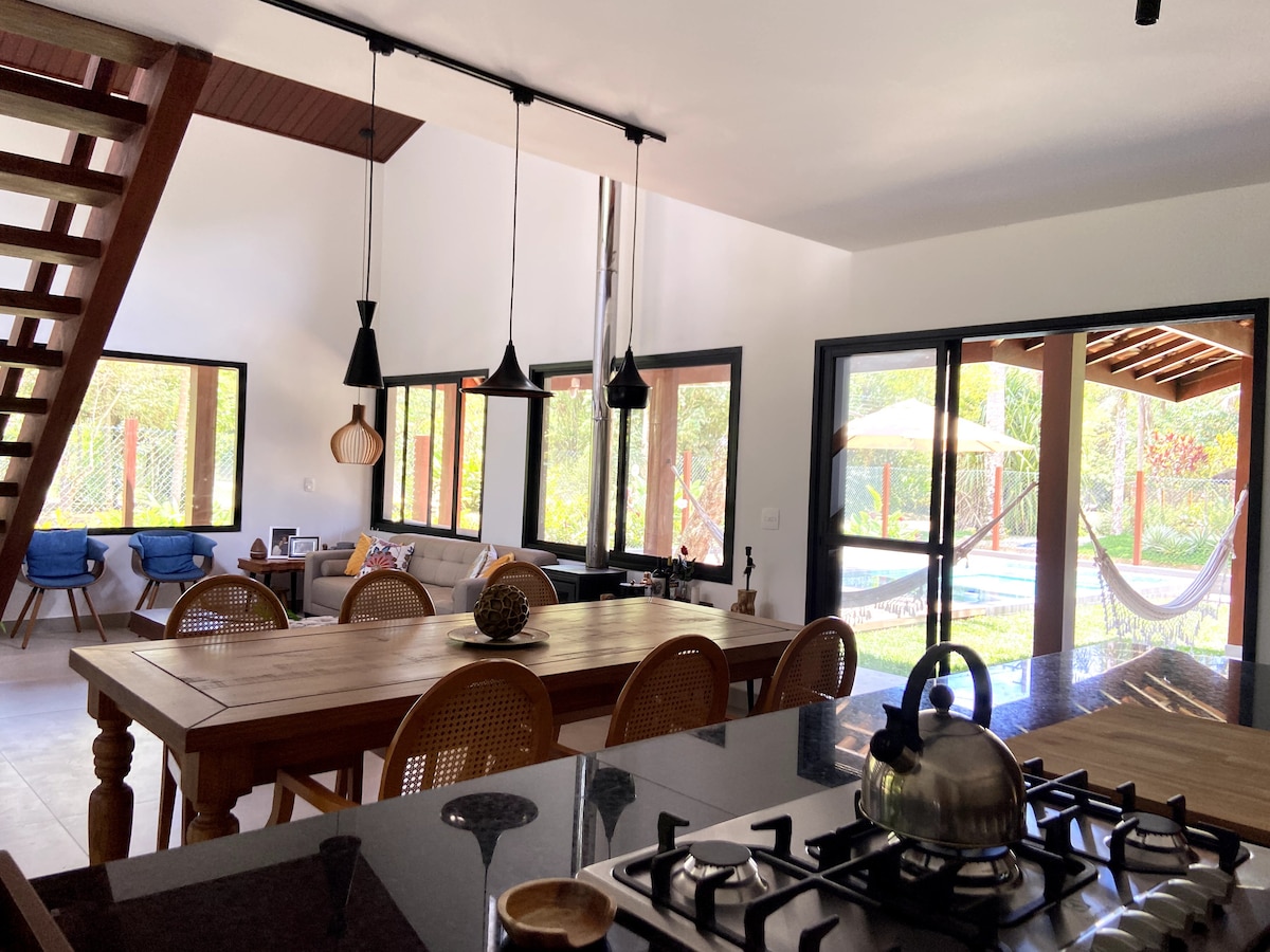 由Carlos Lemos設計,我們的房子是一層樓,寬敞且超級明亮。 坐落在一塊地上,享有海景和山景。它被大西洋森林包圍,鄰居很少,距離海灘約500公尺。房子配備齊全,配有全套廚房和洗衣房,所有房間均配有高速互聯網(100Mb)和Wi-Fi。客廳有壁爐,戶外陽臺非常寬敞,有甲板、吊床和便攜式燒烤爐。