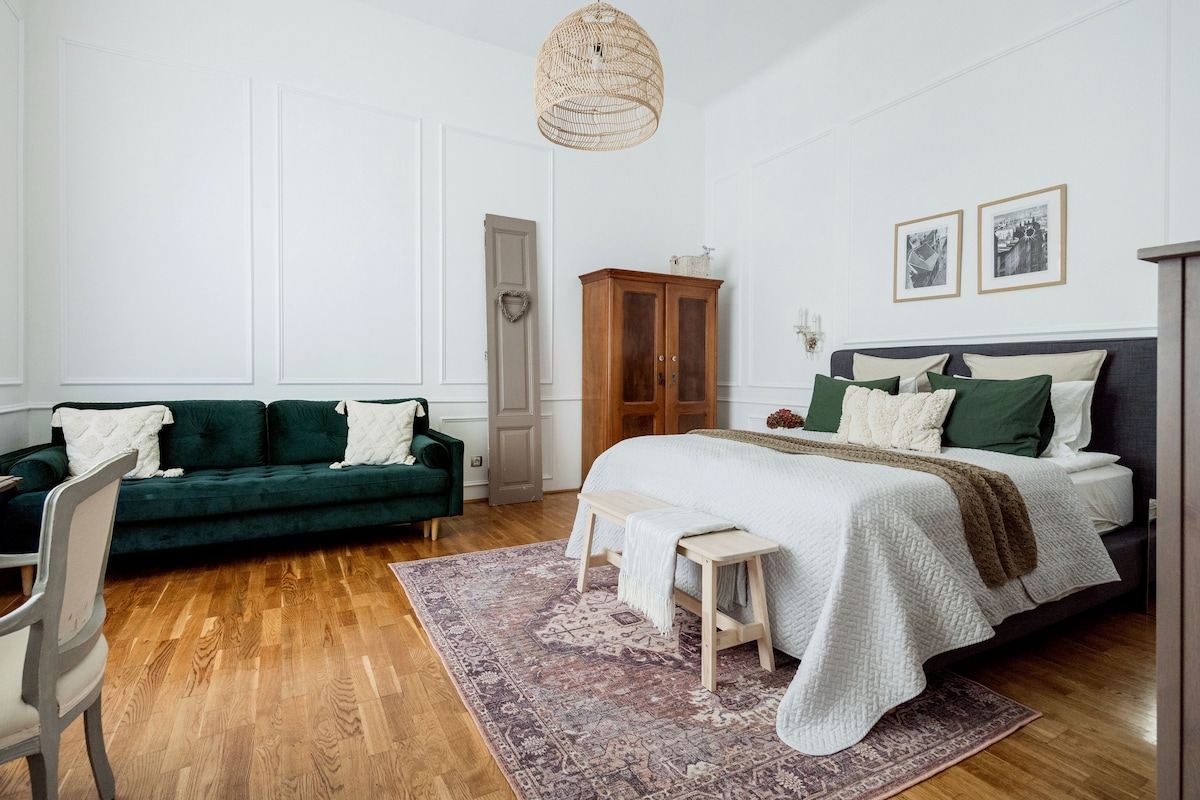 位於舊猶太區的可愛精品套房。探索城市的完美位置。全新翻修,舒適的公寓,位於1910年代的建築物中。享受充滿活力的街區,享受夜生活、歷史感和現代生活水準。這間舒適的套房面積為75平方公尺,有2間臥室、2間浴室、起居用餐區、設備齊全的廚房、WiFi、空調、國際電視頻道。距離紐約咖啡廳、大猶太會堂500公尺,距離歌劇院、Andrássy Ave. 800公尺,距離St. Stephan Basilica或Váci utca。