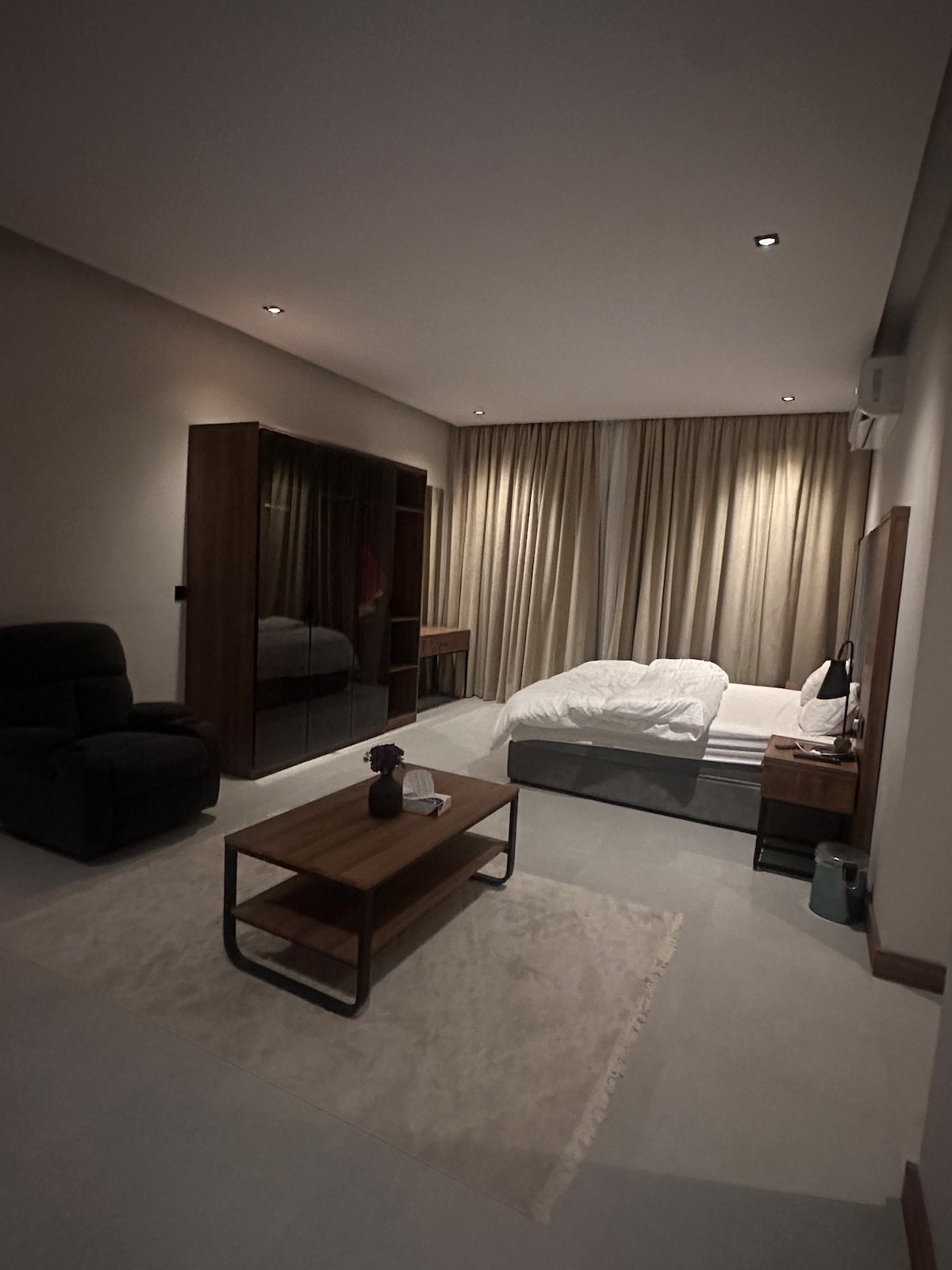 在配備舒適加大雙人床、椅子、桌子和迷你冰箱的現代化套房公寓中享受舒適的住宿體驗。 套房公寓還包括獨立衛浴、冷暖氣、衣櫃和電視。 位於Al-Mahrajan區,伊德祈禱區對面,前往Boulevard ( 6分鐘)、Tabuk Park Mall ( 5分鐘)和機場( 15分鐘)都很方便。 立即預訂,獲得獨特舒適的體驗!