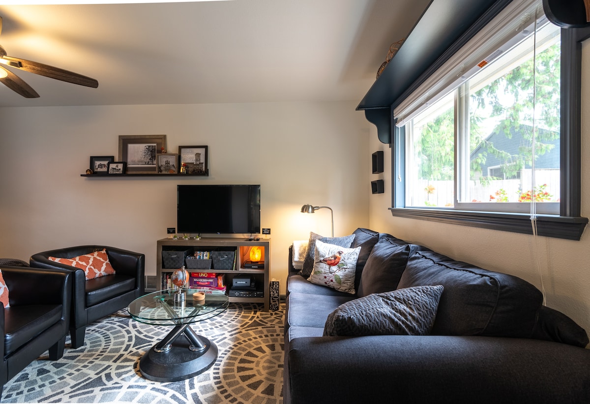 入住我們於2023年春季竣工的全新客用住房,感受無與倫比的風格和獨特世界。 這間現代化客用住房提供最佳設備與服務,讓您的住宿輕鬆、溫馨和舒適: -每次清潔和消毒 -輕鬆抵達I-5 ,距離不到1英裏! -靠近雜貨店、餐廳、娛樂場所和商場 - 55英寸4K Roku智慧電視 -高速WiFi -迷你分離式公寓,提供空調和暖氣 -燃木壁爐 - 2層電動車充電器