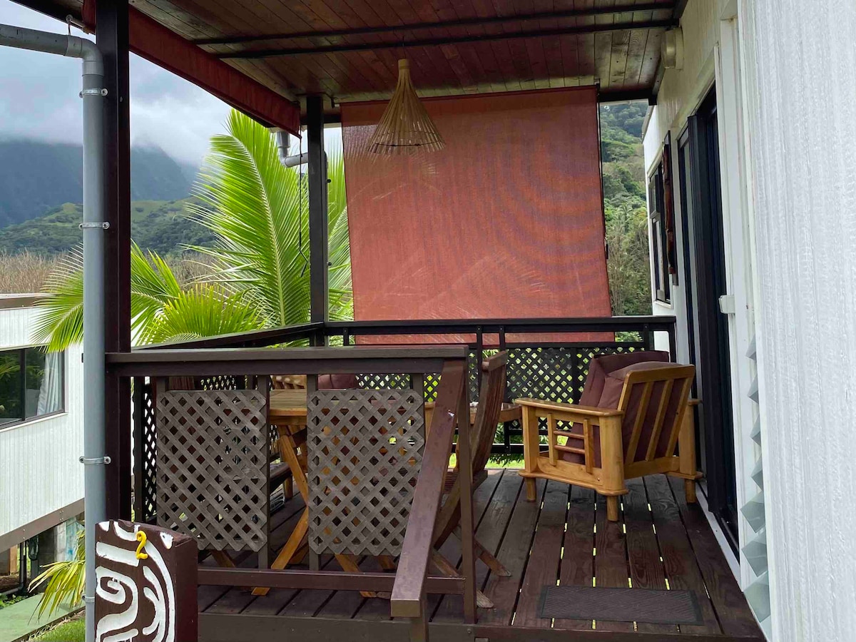 Bungalow duplex indépendant, bord de mer, situé dans une propriété privée. 1 chambre climatisée avec 1 grand lit 2 places + 1 canapé-lit. Un espace cuisine et salle de bain. Terrasse privative exterieure dans jardin bord de l'eau. 2 kayaks à disposition pour accéder au banc de sable à 100 mètres du faré et au spot de surf de Taapuna, à 800 m. Aéroport international /inter-îles à 10 minutes en voiture. Supermarché ouvert 24h/24 à 10 minutes à pieds. Restaurants, snack et roulottes à proximité.