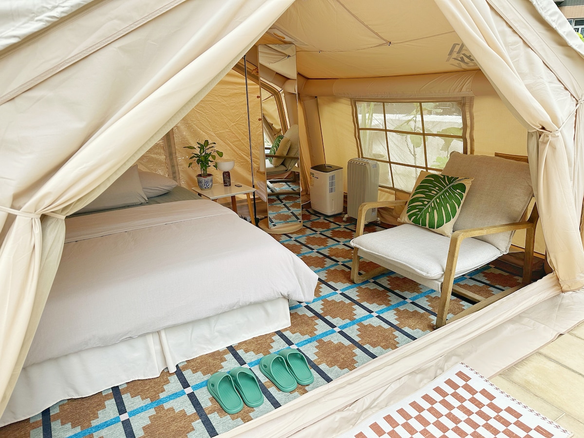A private rooftop tent stay in Mid‑Levels, offering open‑air living and a rare pocket of calm above the city. The tent is fully equipped with AC, heating, a dehumidifier, soft lighting, and a queen bed. Just outside are your own WC/shower, sink, mini fridge, and a dining table for six. The street is steep and the building has no elevator—you’ll climb four flights to reach the rooftop. Pack light and enjoy a peaceful escape above Hong Kong!