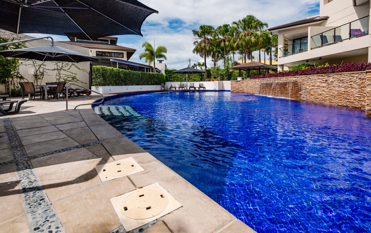 2 bedroom, 2-bathroom apartment in a 5✩ resort, located directly across from the swimming beach. Features include a full kitchen, ducted AC, sofa bed and free WiFi. King master with ensuite. The second bedroom is set up as two single beds & can be converted to an extra-large bed on request & with sufficient notice. Resort facilities: gym, steam sauna, and heated lagoon pool.