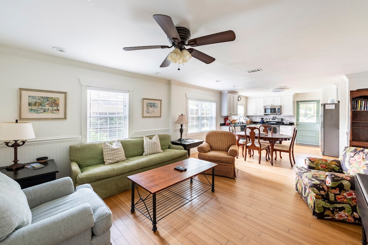 位於Talahi島的舒適、更新的小屋,位於歷史悠久的薩凡納和美麗的泰比島之間。在私人遮蔭門廊的搖椅上,享受微風和公牛河(Bull River)的景觀,以及經過薩凡納河(Savannah River)的貨船。距離餐廳和商店、普拉斯基堡國家公園和風景優美的步行/自行車道僅5分鐘路程。 請注意,圖中的碼頭屬於我們的鄰居-沒有碼頭或直接通往河流。 *禁止在室內或室外吸煙*
