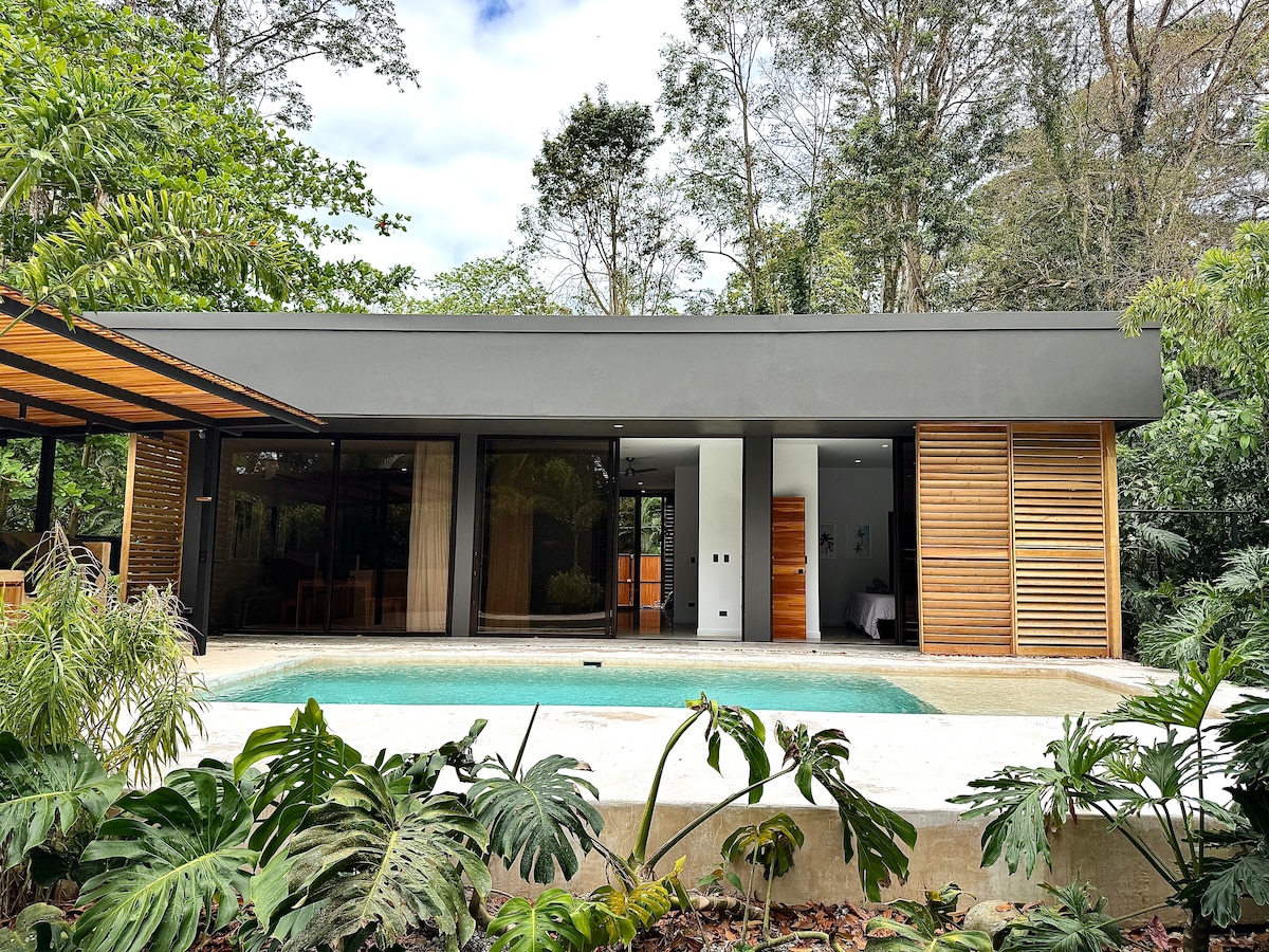 在Casa Bodhi體驗奢華和寧靜,這是一個時尚的度假勝地,採用開放式平面圖,在室內和室外生活之間創造無縫整合。 步行5分鐘即可抵達黑沙灘! 這棟住宅擁有9英尺高的三層滑動玻璃門,可打開空間。 享受現代化的設施,如空調、加大雙人床、海水泳池和跳水泳池。 醒來時,就能看到叢林的景色,聽到叢林的聲音,還有吼猴、帝王蝶和樹懶!