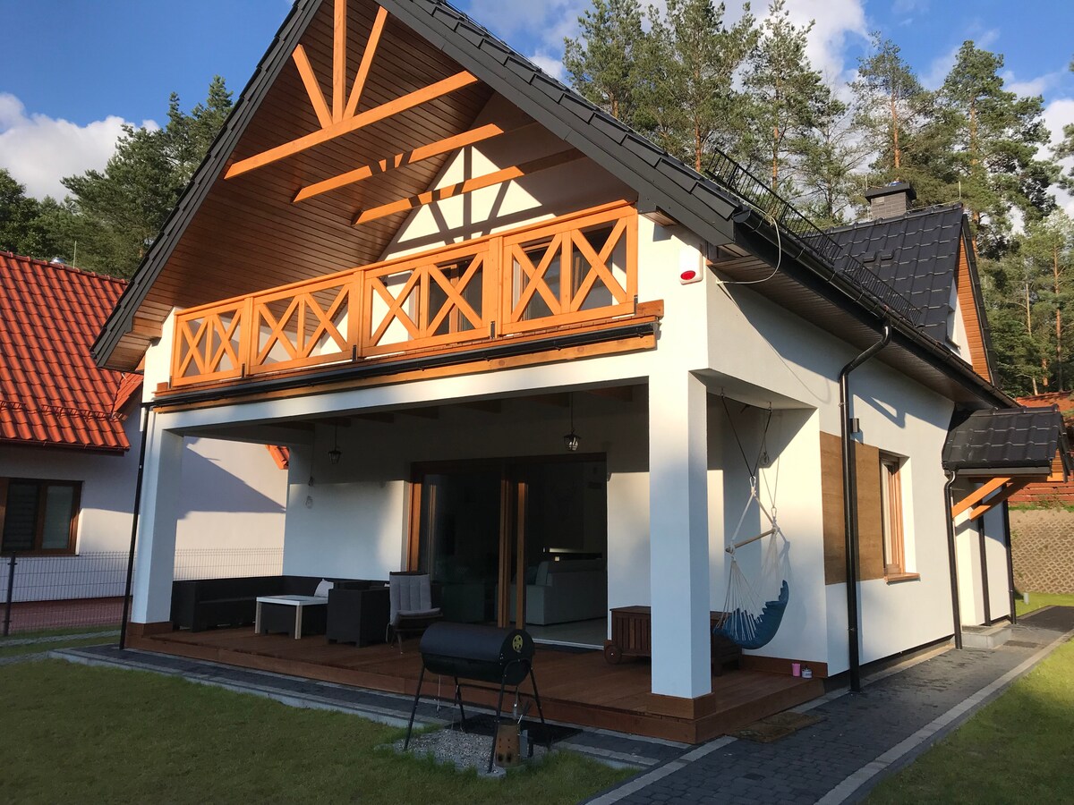 馬蘇里亞是波蘭的一個美麗地區,四面八方都是天然湖泊。對我們來說,與無所不在的馬蘇里亞大自然接觸是我們的首要任務。這就是為什麼只有六棟房子位於大片區域,讓房客感到舒適。無論是白天還是一年中的任何時候,客廳和寬敞露臺的玻璃都能欣賞到獨特的景觀(房屋配有壁爐和中央暖氣)。共用區域包括廣闊的草坪區域和一個蔬菜園。