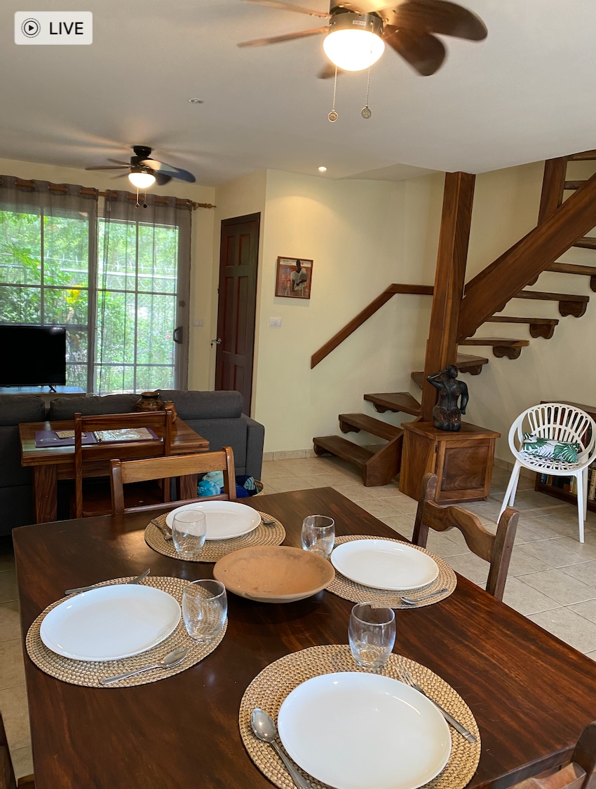 這間2間臥室/2間浴室坐落在大自然中,但步行幾分鐘即可抵達所有城鎮的設施。 這間現代公寓明亮通風,擁有高高的木製天花板,配有風扇和空調。 設備齊全的廚房、可俯瞰大型泳池的寬敞陽台。 欣賞海景,還有日落和吼猴的美景。 步行即可抵達海灘,您可以從房源的兩個大門進入,在那裡您可以探索衝浪、旅遊等。