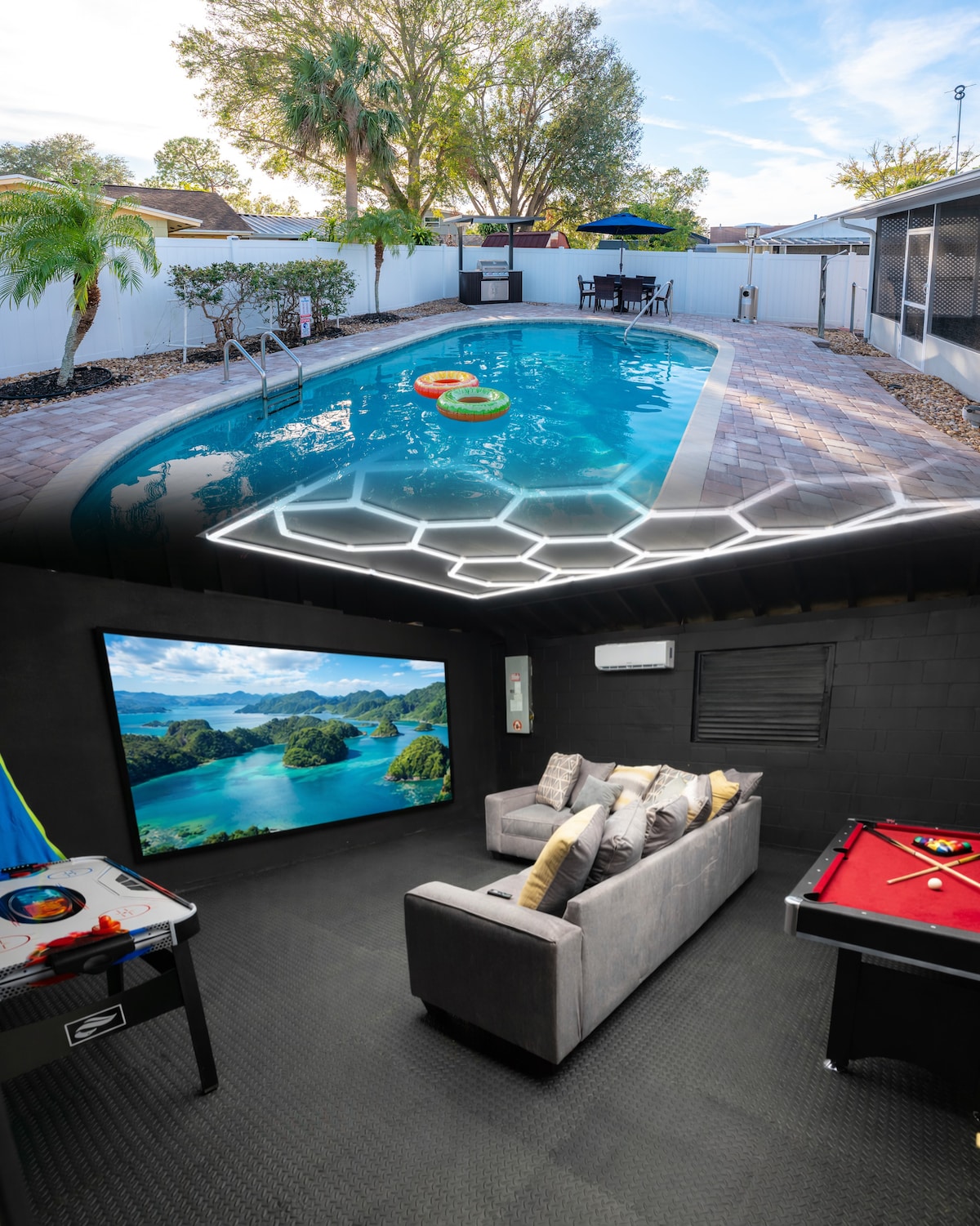 歡迎來到Clearwater Hangout -這間超級獨特的房源旨在提供許多便利設施。距離著名的清水海灘(Clearwater Beach)僅4英里!全新翻修,配備全新瓷磚和石英櫃檯,打造高端時尚設計。室內設施包括:LED 梳妝台、桌球/乒乓球、葡萄酒冰箱、14 人用餐區,以及配有籃球場、Pac-man 機器和家庭劇院的全面改造遊戲室!外面是一個非常私人的乾淨空間,有迷你高爾夫球場、鹽水泳池、休息區和火坑