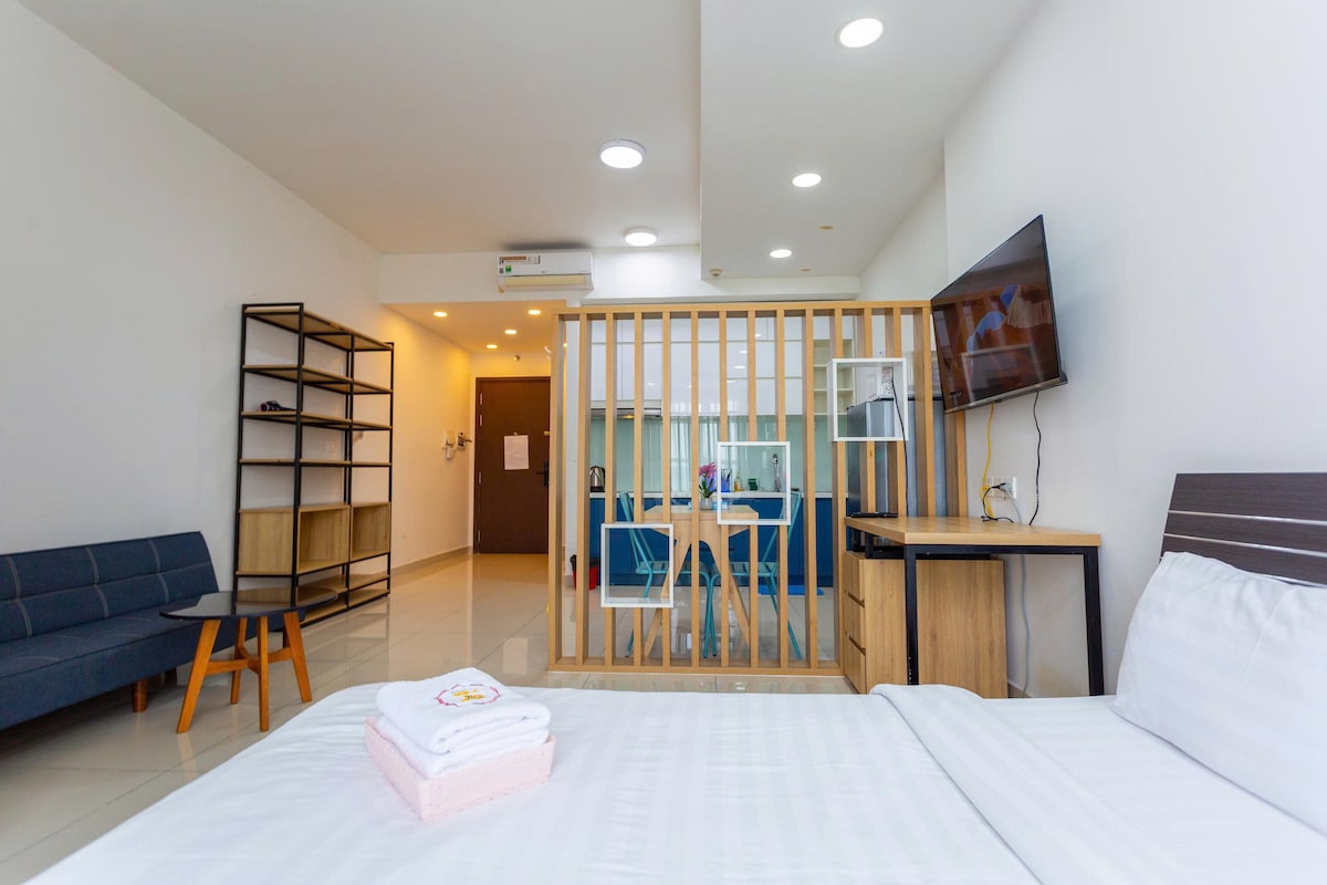 位于 A 办公楼的 40 平方米休闲工作室。公寓位于第 7 区(靠近第 4 区和第 1 区)的绝佳位置 - 靠近一切 - 2 分钟到乐天玛特 - 5 分钟 - 7 分钟到 SC Vivo City、Crescent Mall - 10 分钟到 Bui Vien Str.,(那里有很多酒吧、酒馆) - 步行 3-5 分钟即可到达周围的药店、餐馆、市场和当地购物区。 *我们的工作室配有全套厨房和餐具。就像您自己家一样的地方。 *安静、干净、芳香。