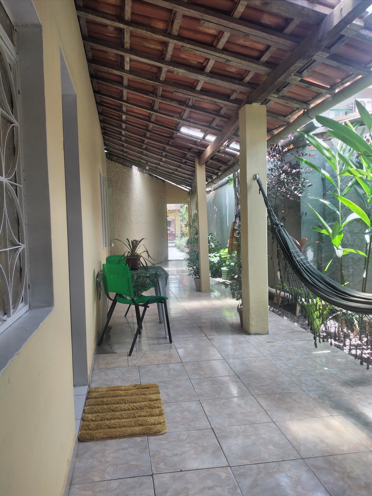 Uma acomodação aconchegante com um jardim amplo, repleto de plantas diversas. Pela manhã os hóspedes são despertados pelo canto dos pássaros. Uma piscina convidativa, ideal para um mergulho refrescante. O local esta próximo ao mar, facilitando o acesso a praia. Na varanda a rede esta disponível para um descanso em um ambiente tranquilo e confortável.