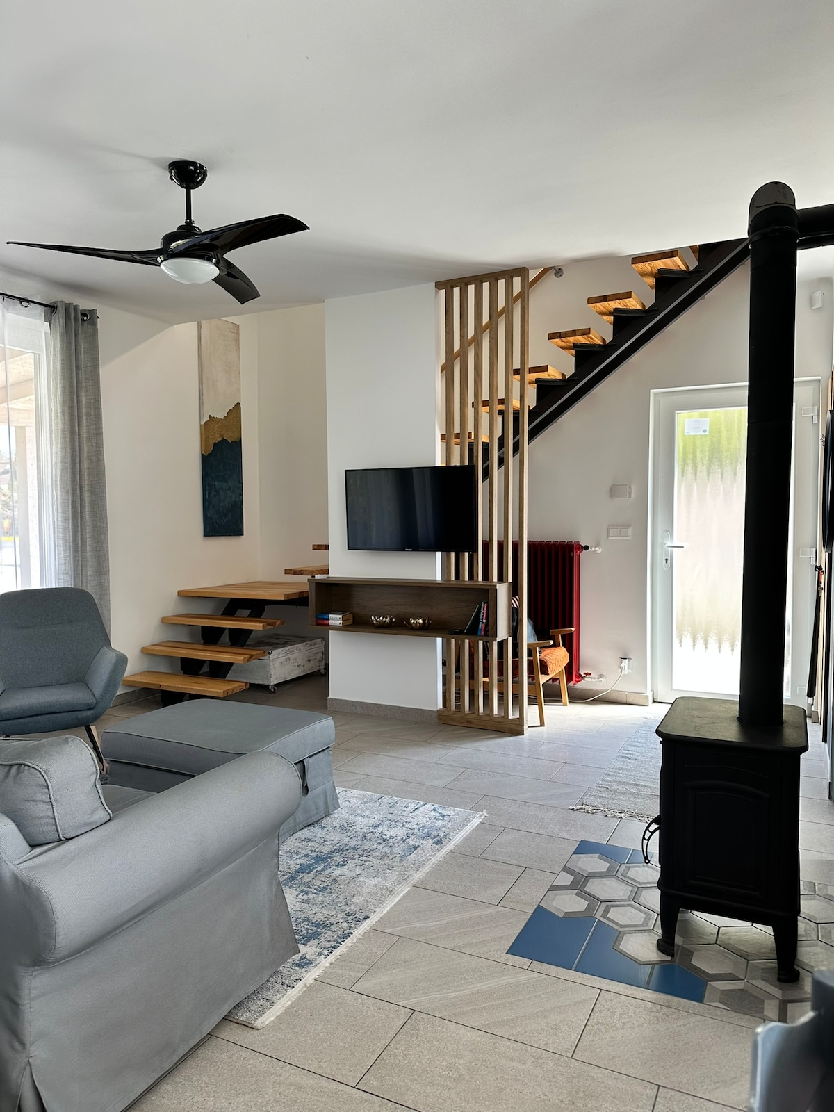 Our brand new holiday home is open for rent all year around in a safe and calm environment. Situated right next to the lake Balaton, we are 5 min walking distance from the popular Silver beach, wich is free of charge. 10 min from Kálmán Imre mall where you can enjoy many restaurants as well as other amusements. From 3 minutes walk, across the elictric railroad tracks you can find a supermarket, a pharmacy and the well known Öreg Halász restaurant.