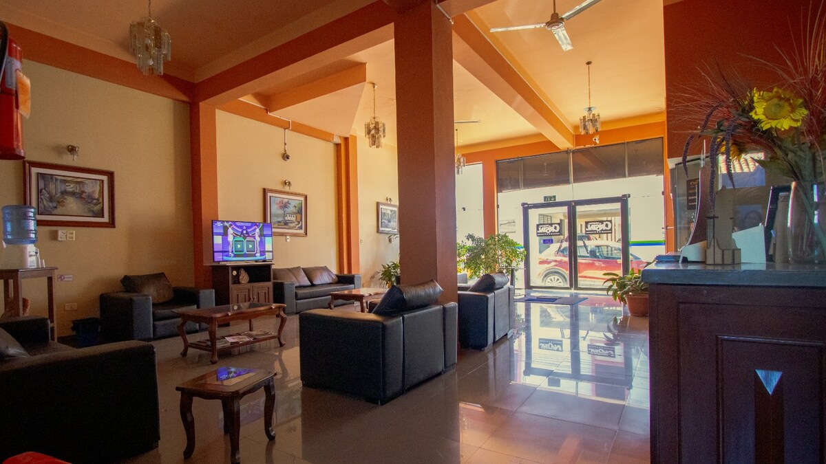 Disfruta de una estadía cómoda en habitaciones privadas con baño, ideales para 1 a 4 personas. Nuestro alojamiento está ubicado en la calle La Paz esquina Delfín Pino, en Tarija, a pocos minutos del centro. Contamos con ascensor, pasillos decorados y un ambiente moderno y seguro. Perfecto para viajeros solos, parejas, familias o grupos que buscan practicidad y confort.