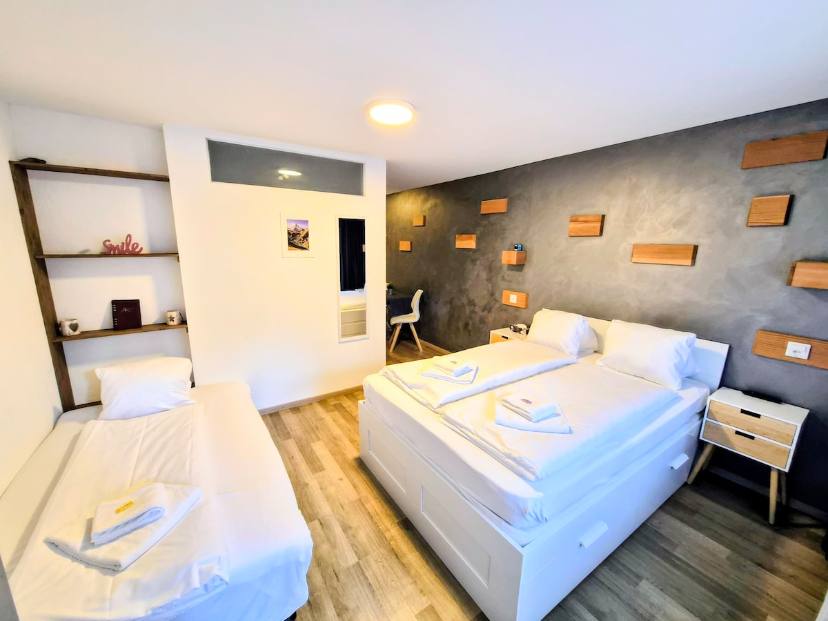 【重要提示】: 價格不包含每人每晚4.00瑞士法郎的旅遊稅,必須在退房時以現金形式留在桌上。 歡迎來到二樓舒適的35平方公尺單間公寓–距離市中心和火車站僅700公尺。 房子入口可經由約20階樓梯抵達。 設備與服務包括: • 開放式 1 間單人套房,配有 1.8 公尺寬雙人床(160 公分)和沙發床(140 公分) •設備齊全的廚房:烤箱、Nespresso 咖啡機、熱水機、無電視、 陽臺